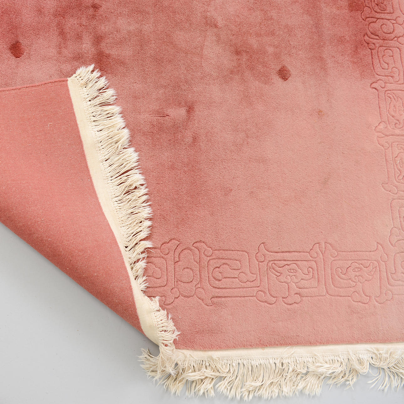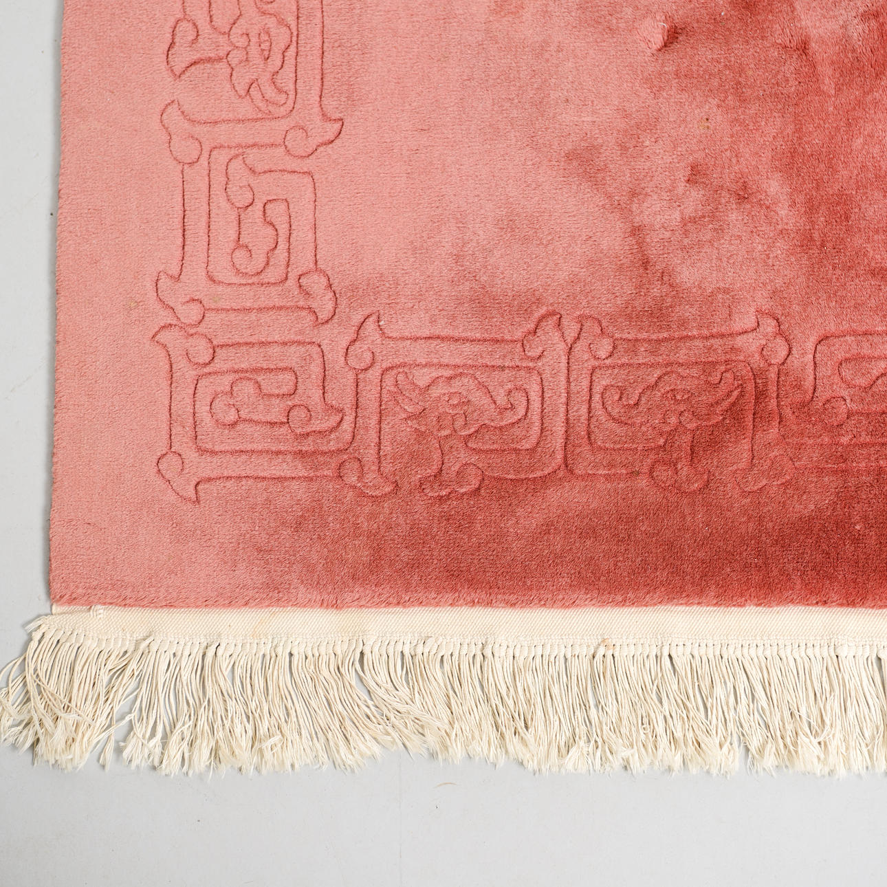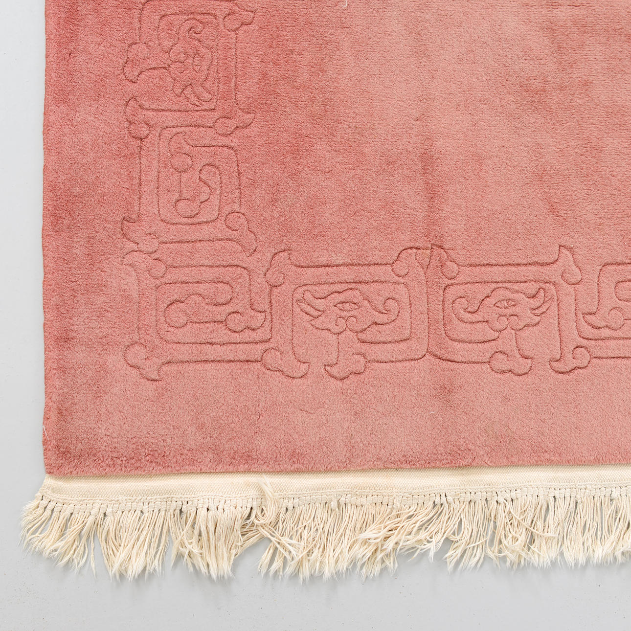 Monochrome field in a muted pink tone with a discreet, tone-on-tone woven border along the edges.