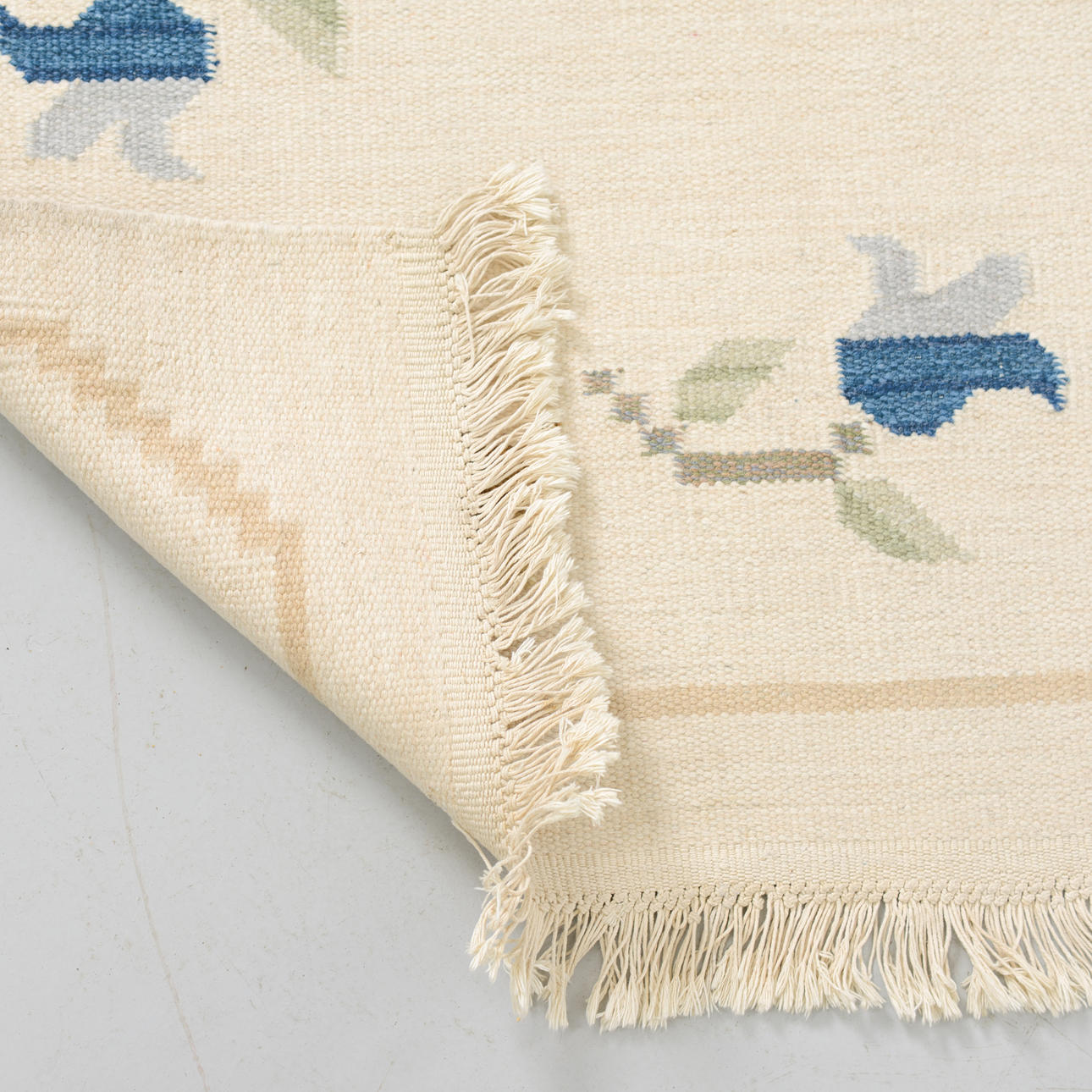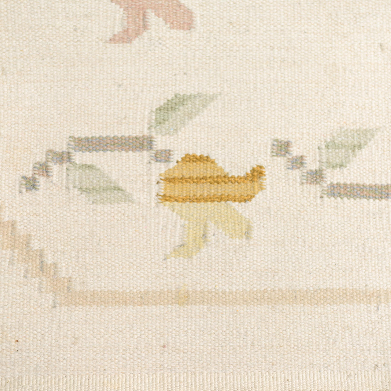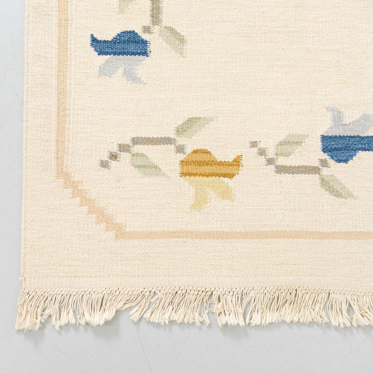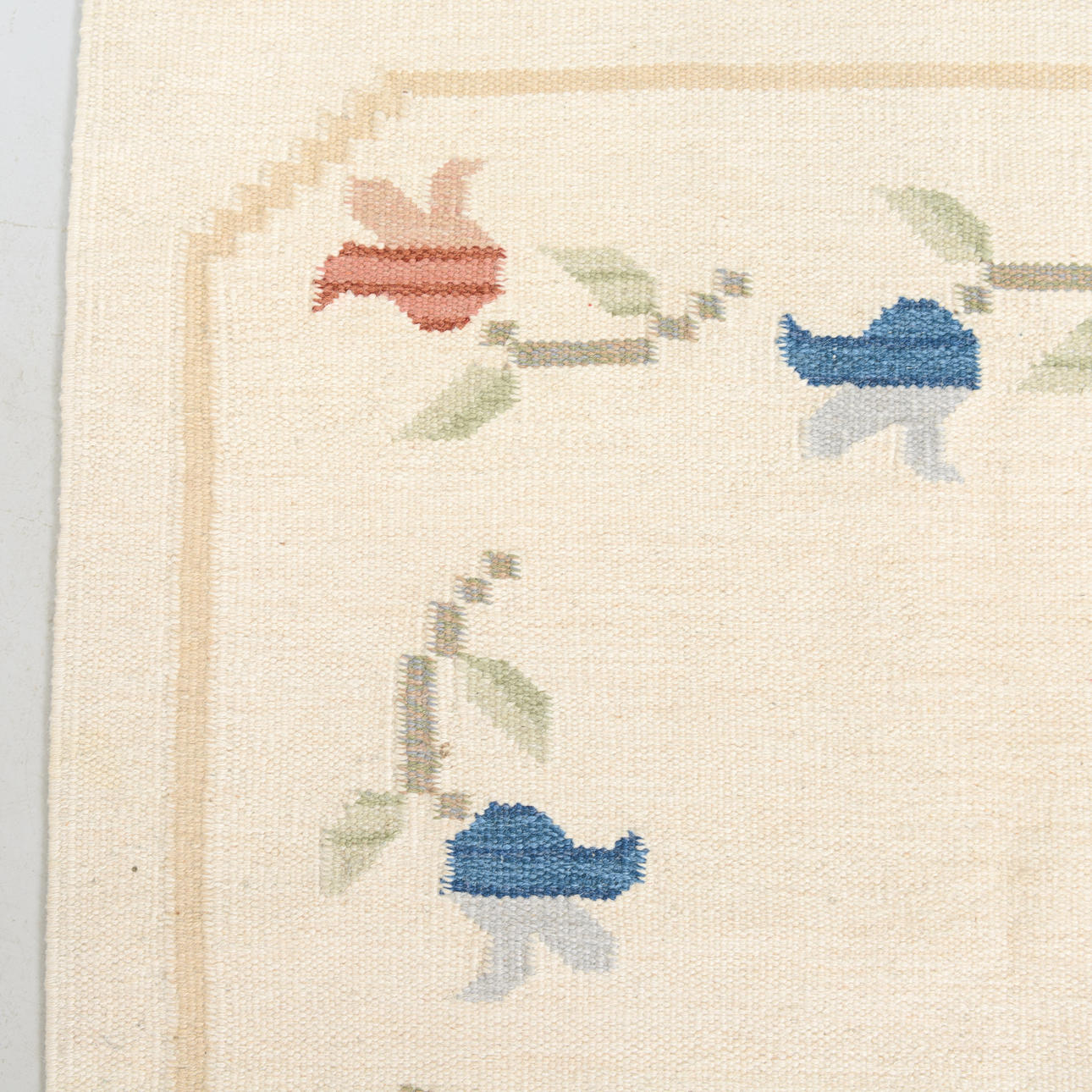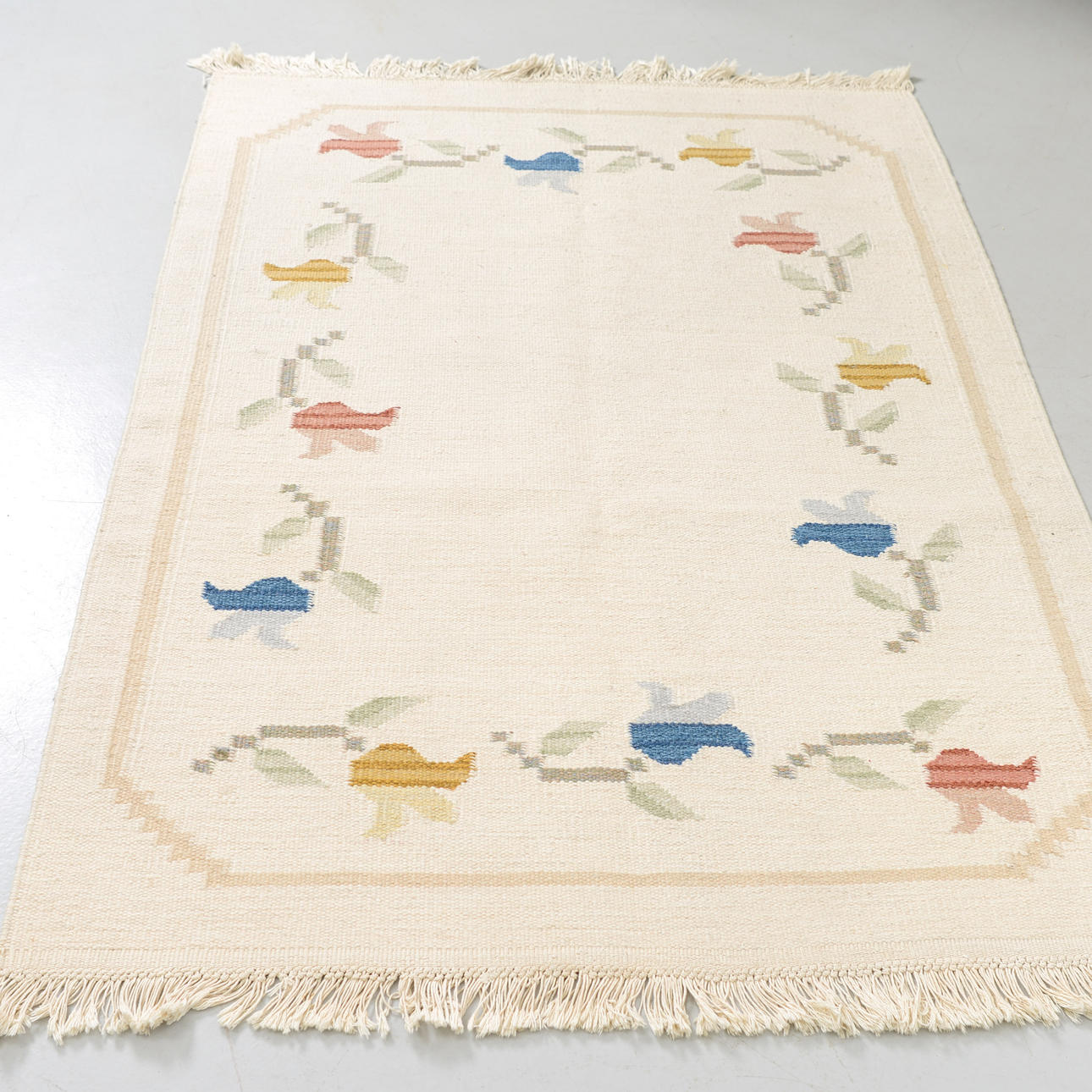 Light ground with an open central field, surrounded by a border with stylized flowers and leaves in muted colours.