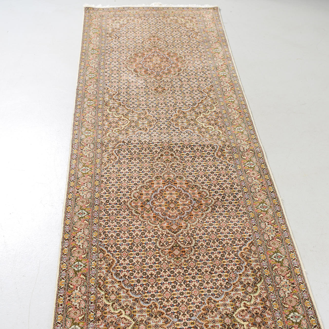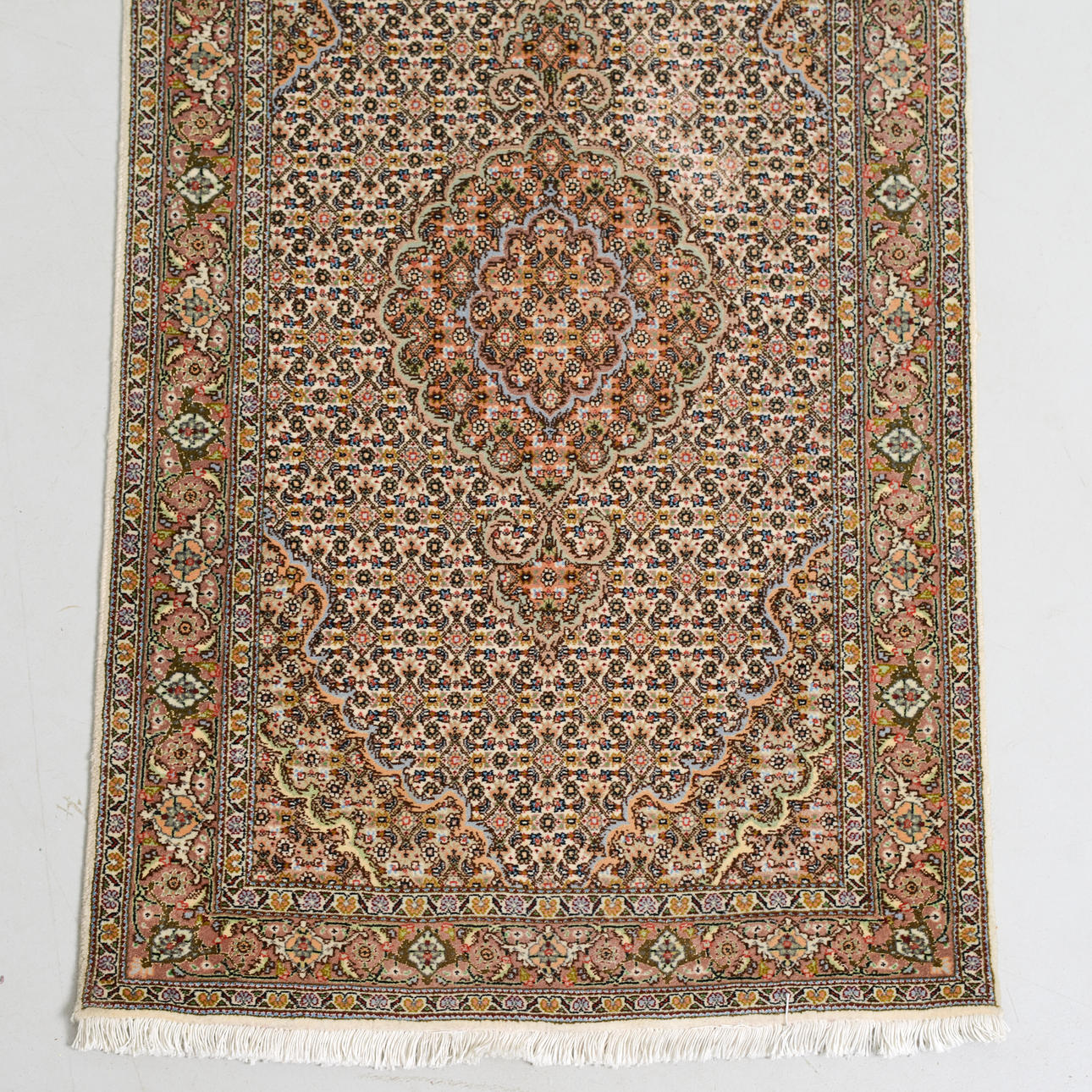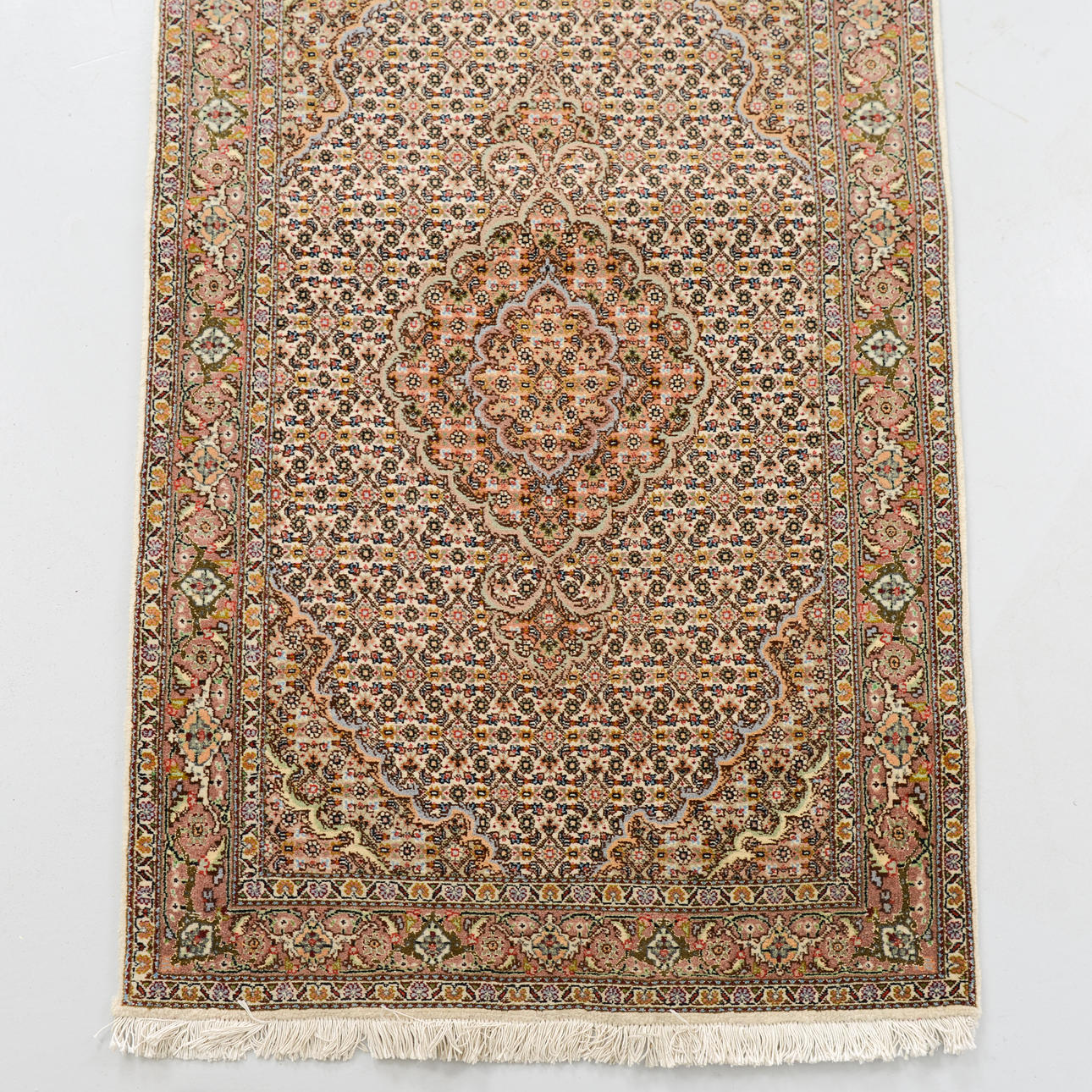 Beige field with a dense small-scale pattern and repeating medallions along the central axis, surrounded by narrow borders with floral and vine ornamentation.