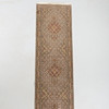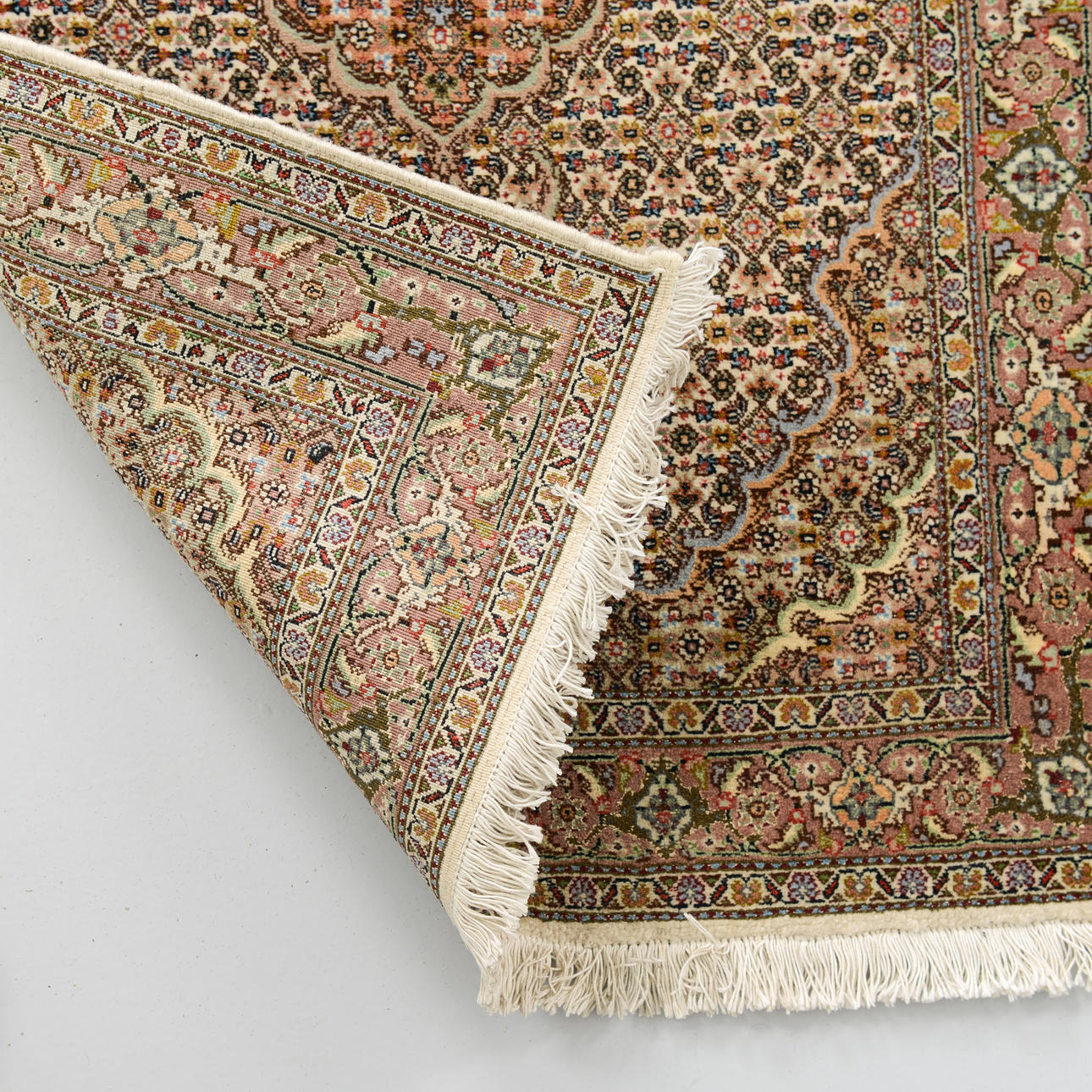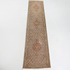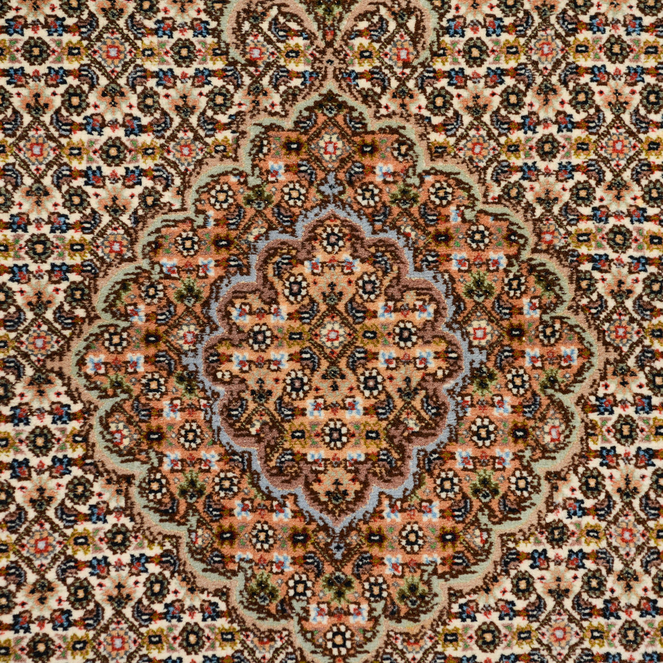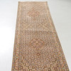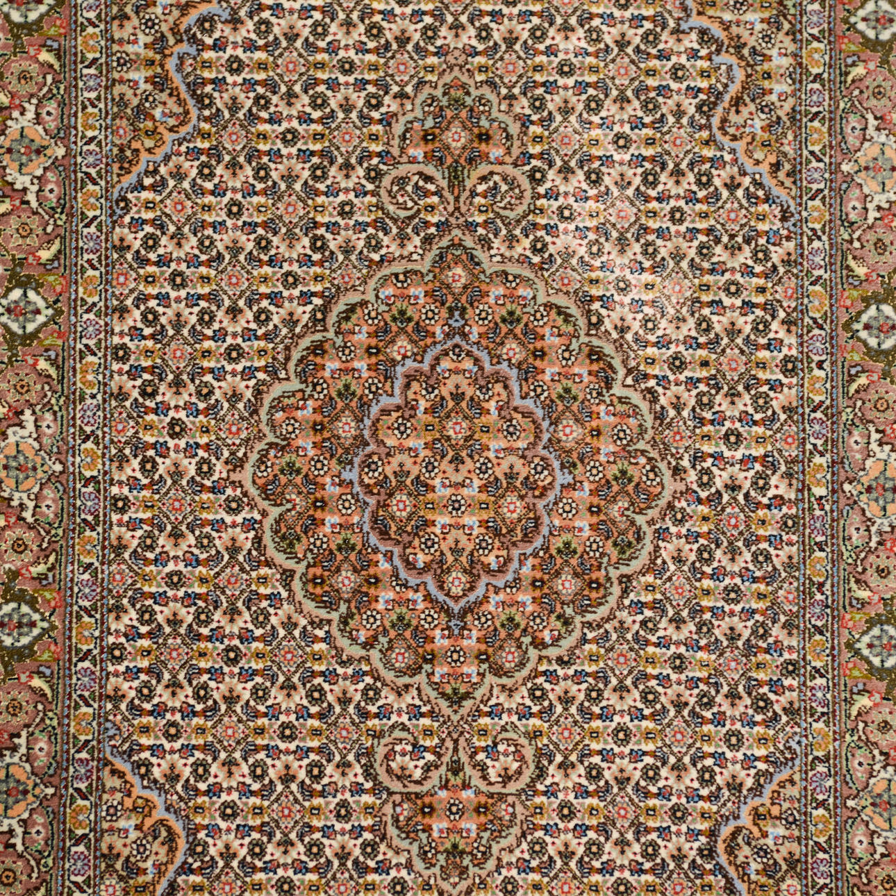 Beige field with a dense small-scale pattern and repeating medallions along the central axis, surrounded by narrow borders with floral and vine ornamentation.