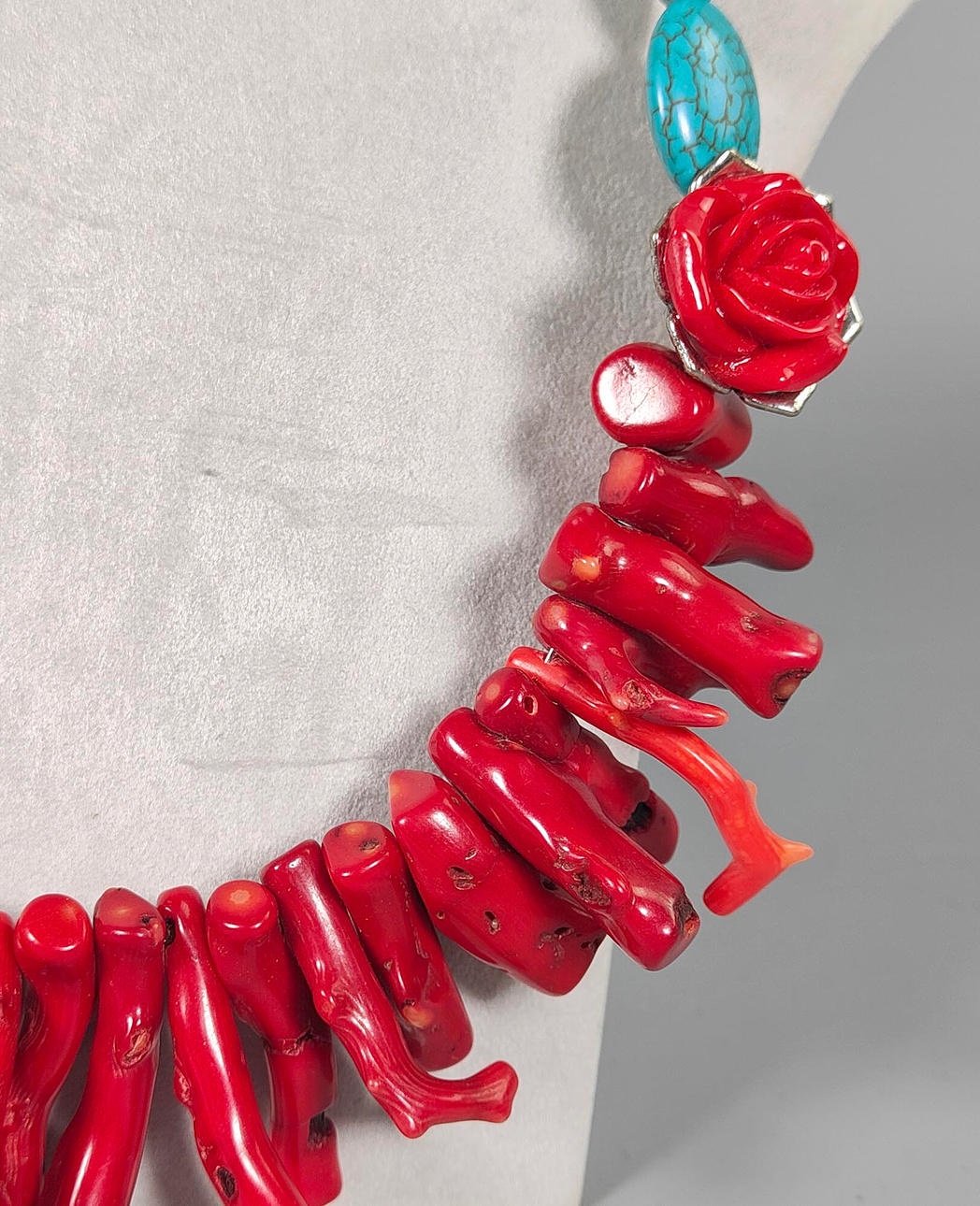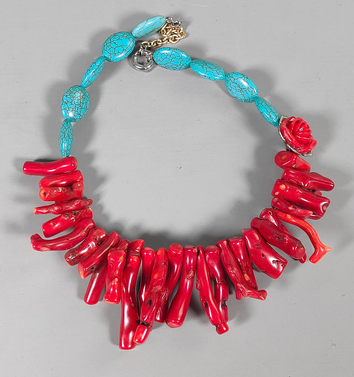 Imposing coral necklace, consisting of a central section made of long coral branches approx. 3.5 - 5.5 cm, length of the necklace 45 cm, weight 185 grams.