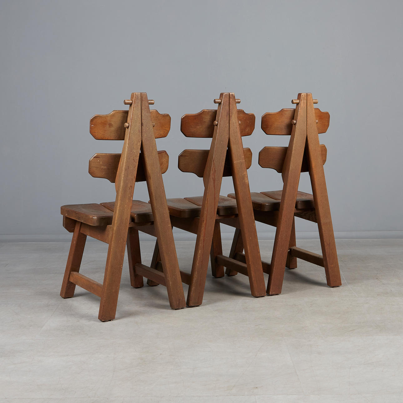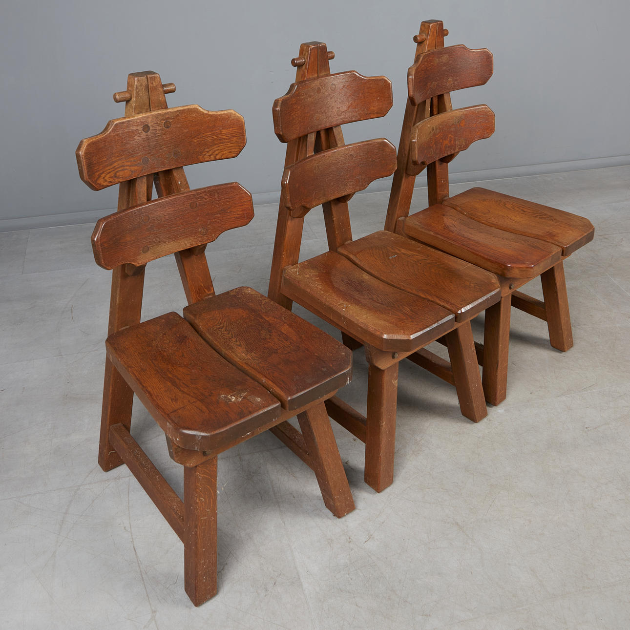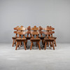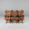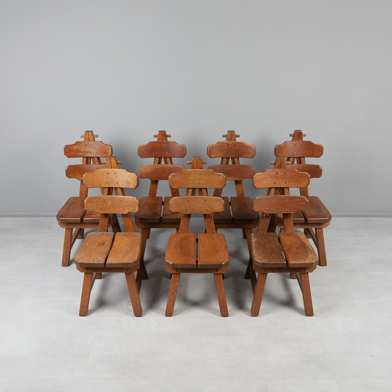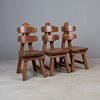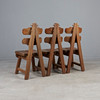 Set consisting of seven brutalist chairs in solid oak with slightly curved backrests.