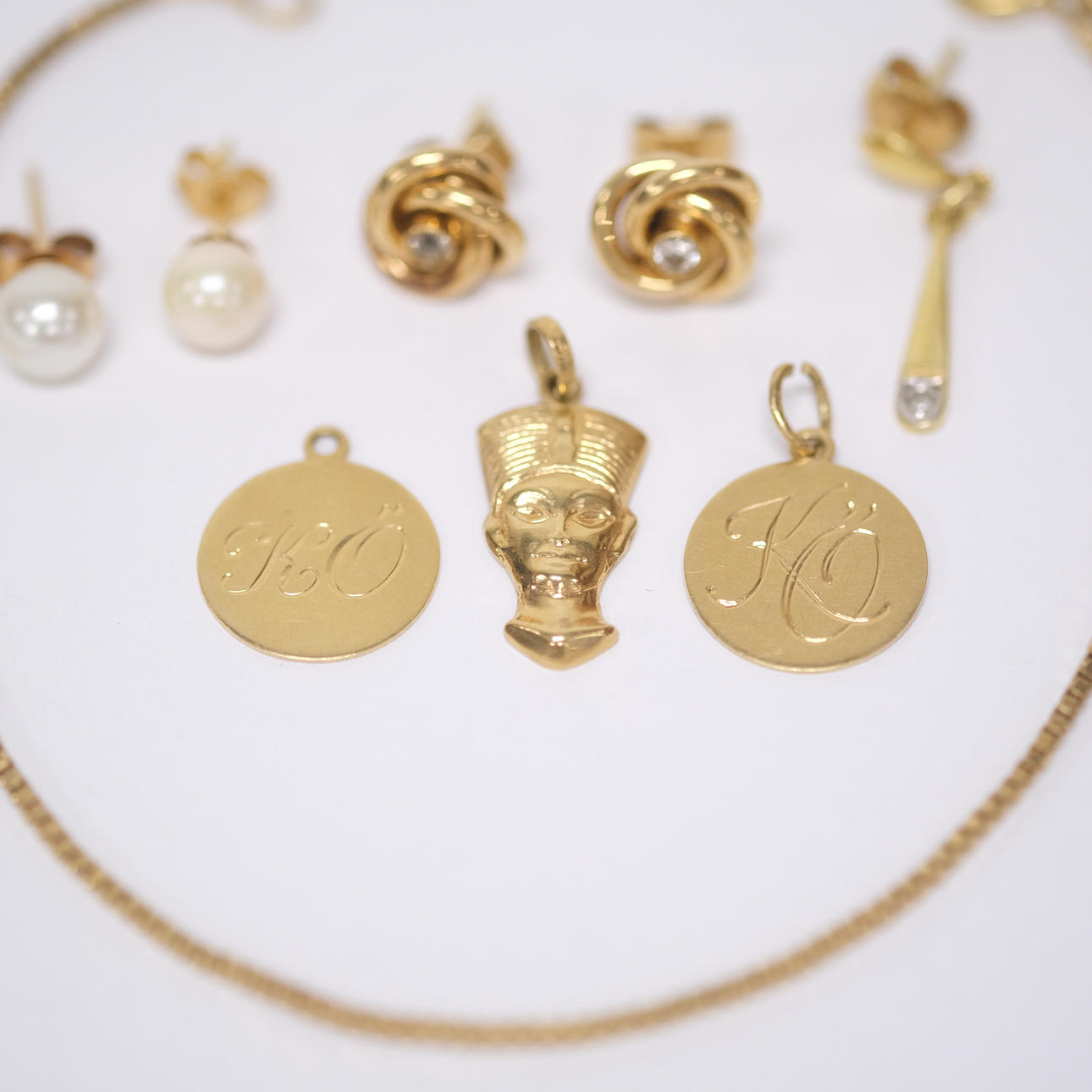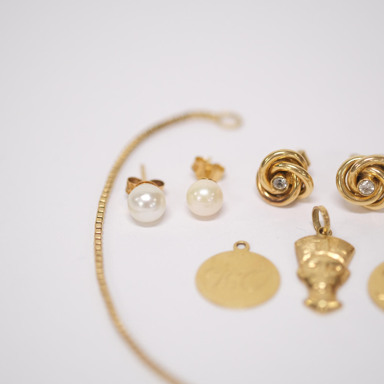 A pair of earrings with small diamonds, bracelet, length 19 cm, 3 charms, one earring, weight approx. 7.8 grams.