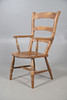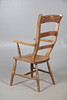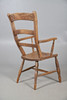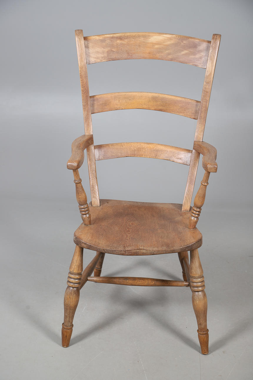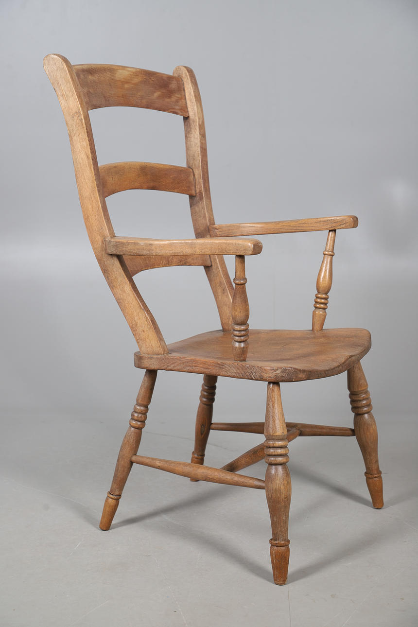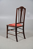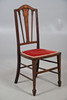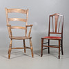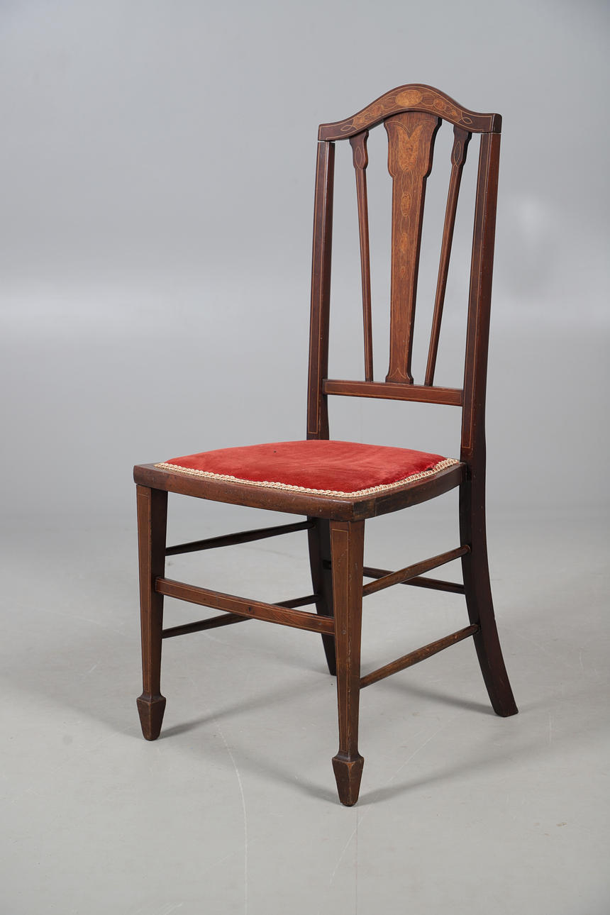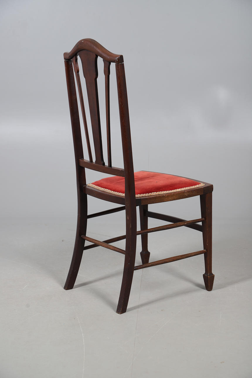 Oak chair with shaped arm rests and raised on turned legs, W51 x H107 x D57, seat H44cm, together with an Edwardian marquetry bedroom chair with red velvet upholstery, W42 x H93 x D42, seat H42cm.