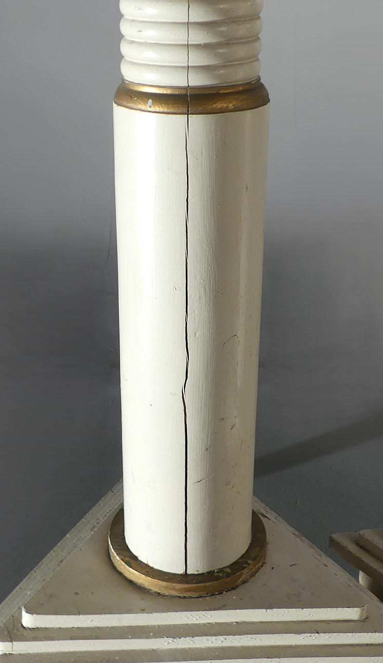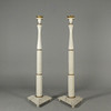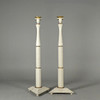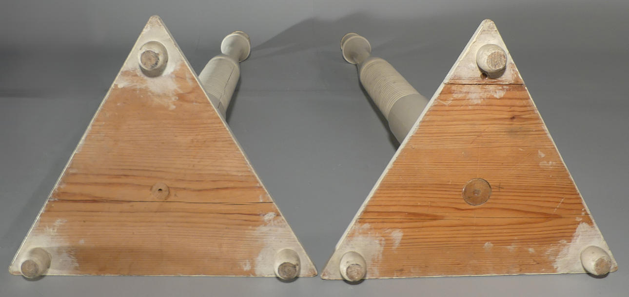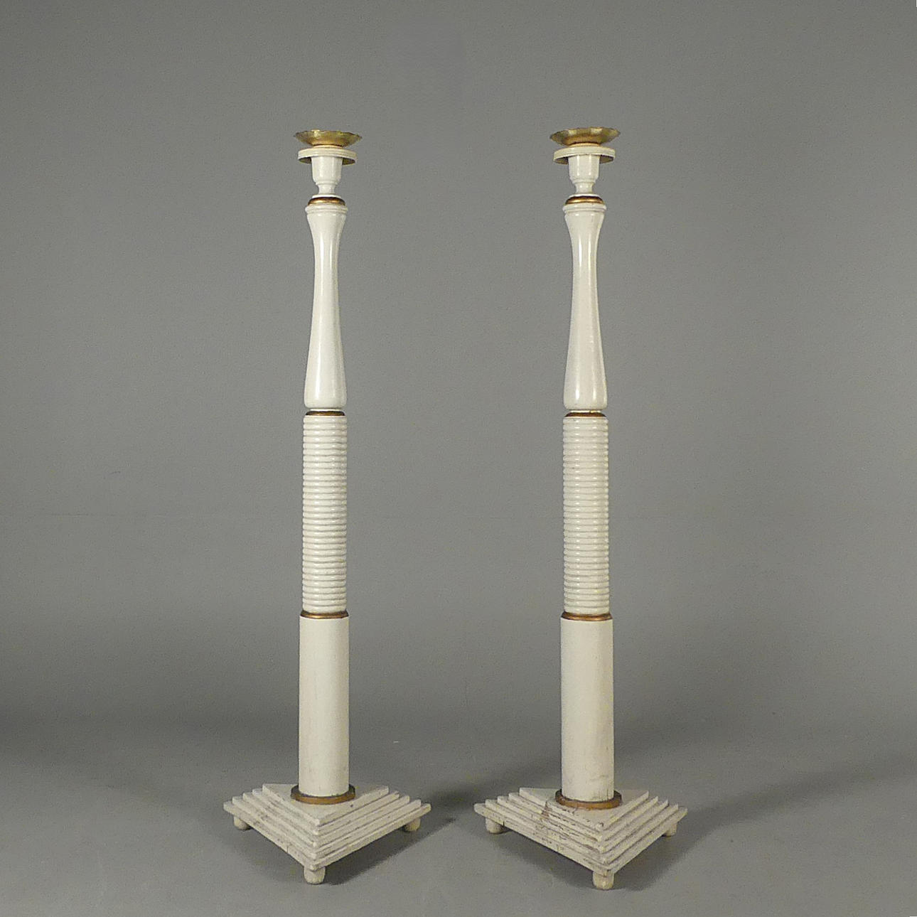 Painted wood with loose metal bobeches. Height approx. 136 cm, triangular base 42 cm.