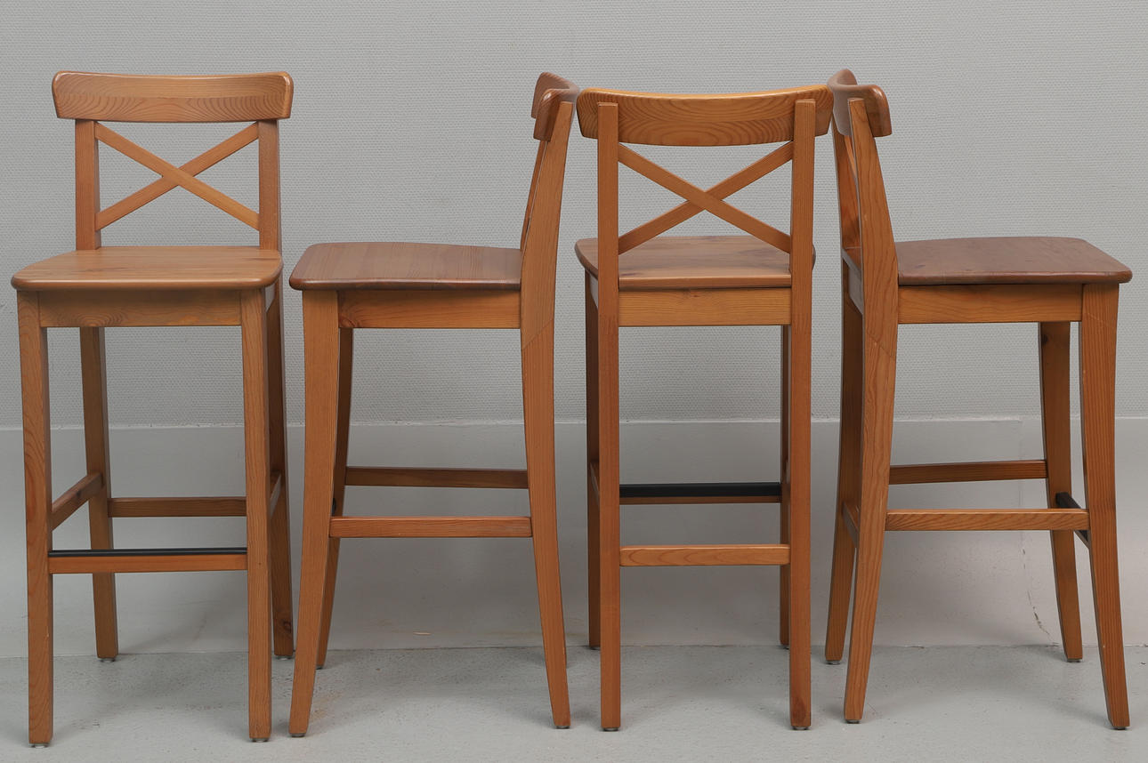 Table, approx. 110x70 cm, height approx. 102 cm. 4 bar stools, backrest height approx. 103 cm, seat height approx. 74 cm, width approx. 39 cm.