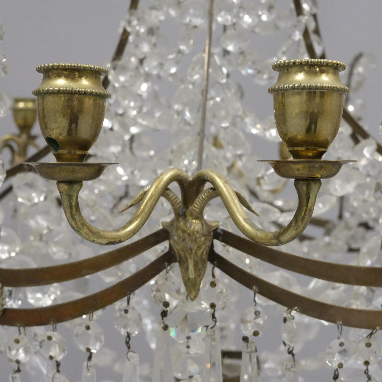 Space for twelve candles. Not electrified. Stave prisms. Decoration with goat heads. Height 85 cm, diameter 70 cm.