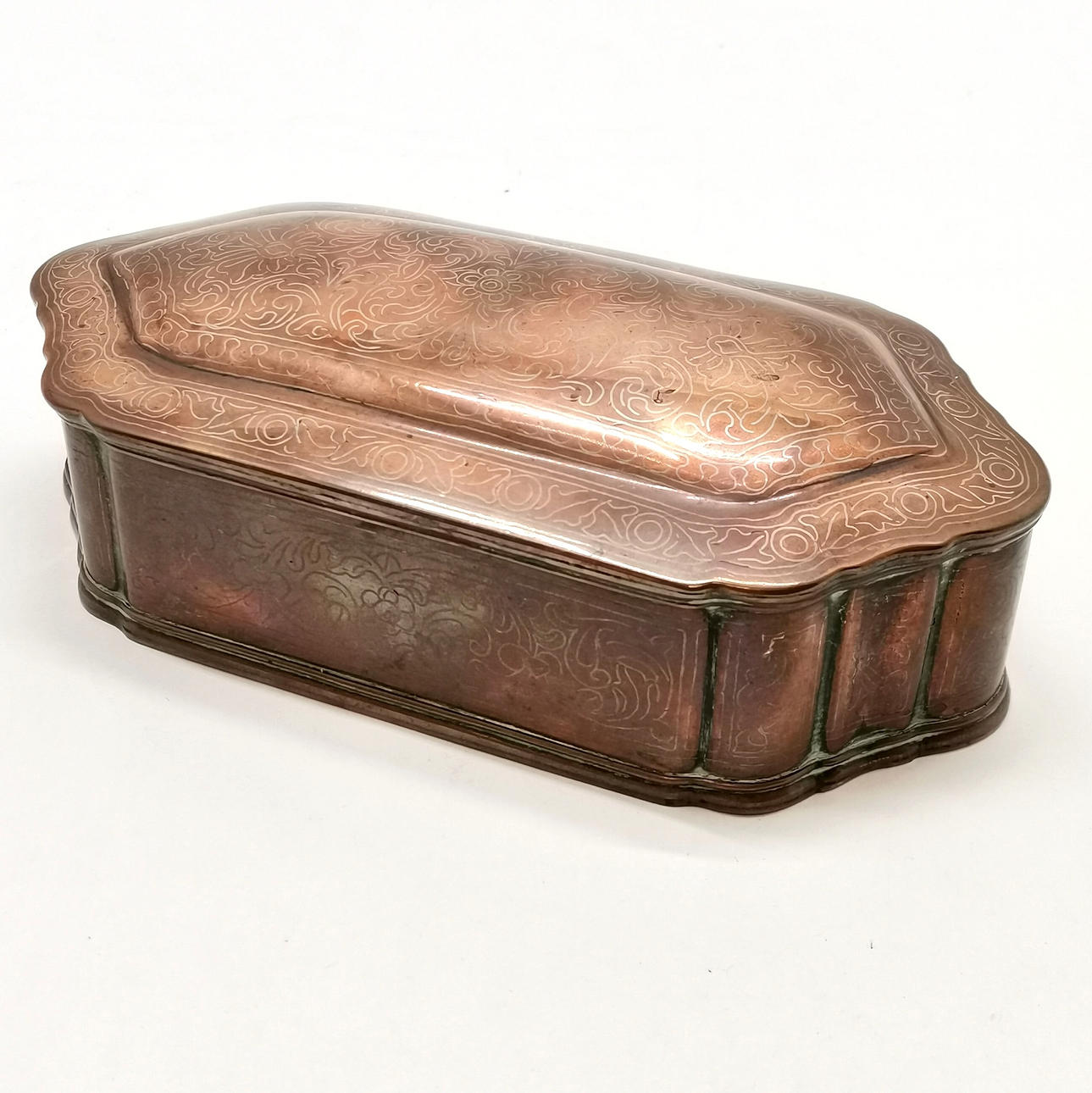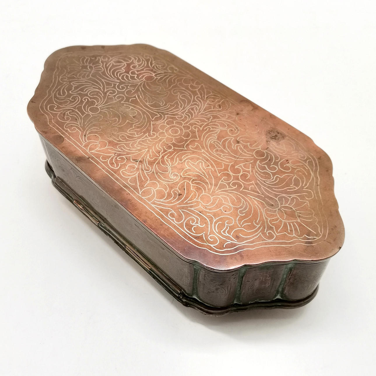Antique silver inlaid copper hinged lidded box - 20cm across x 9.5cm x 6cm.