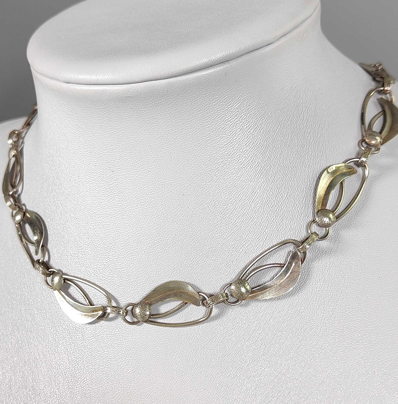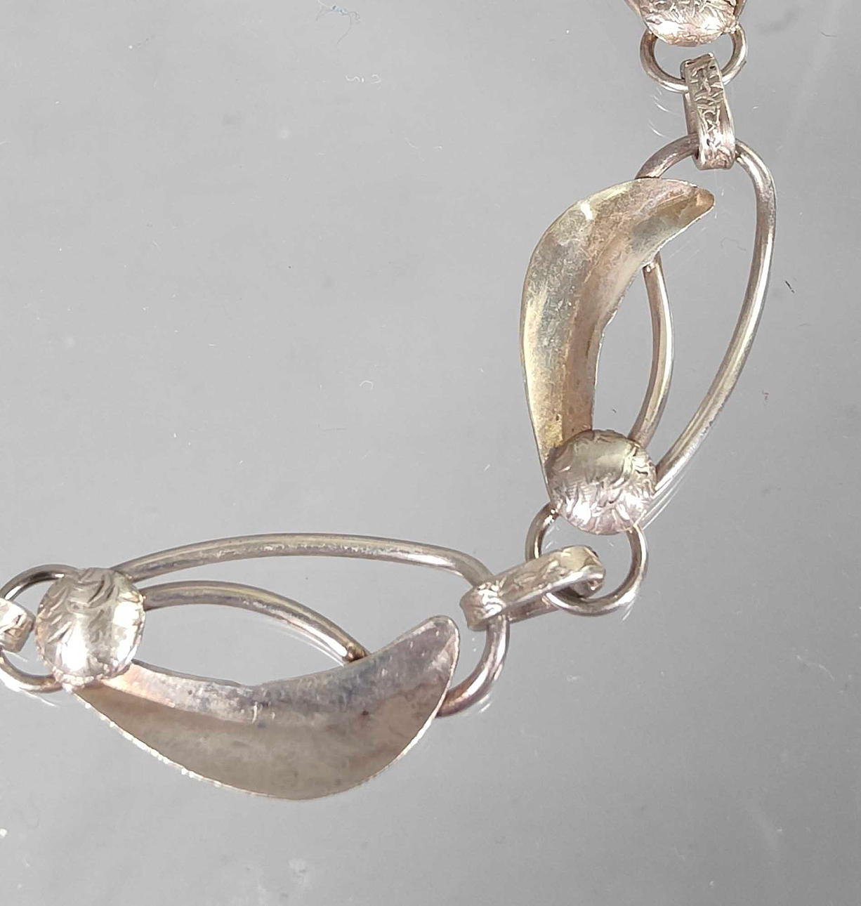 hallmarked silver 800, approx. 19.8 grams, the necklace consists of articulated leaf links, length with spring ring clasp approx. 45 cm.