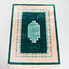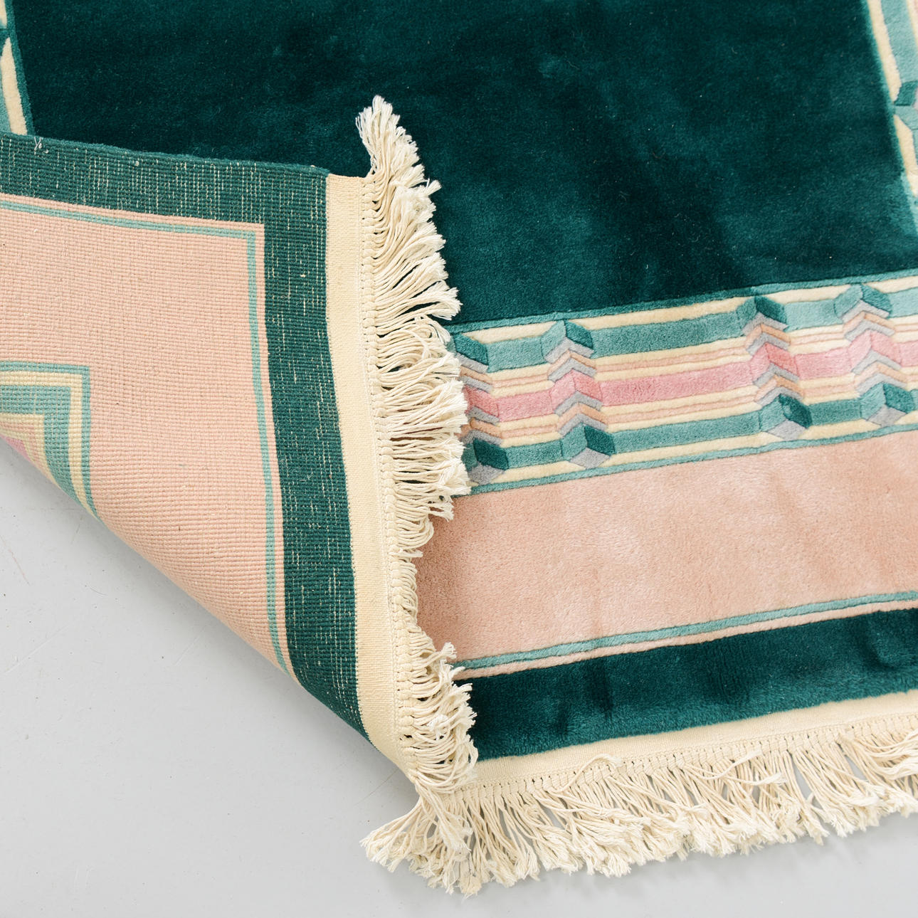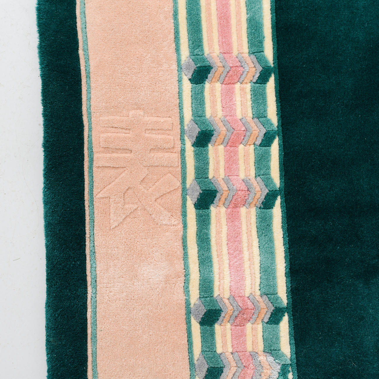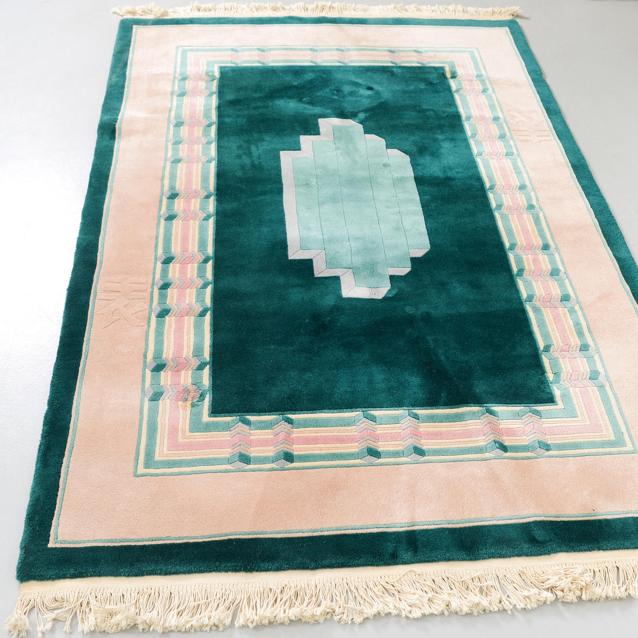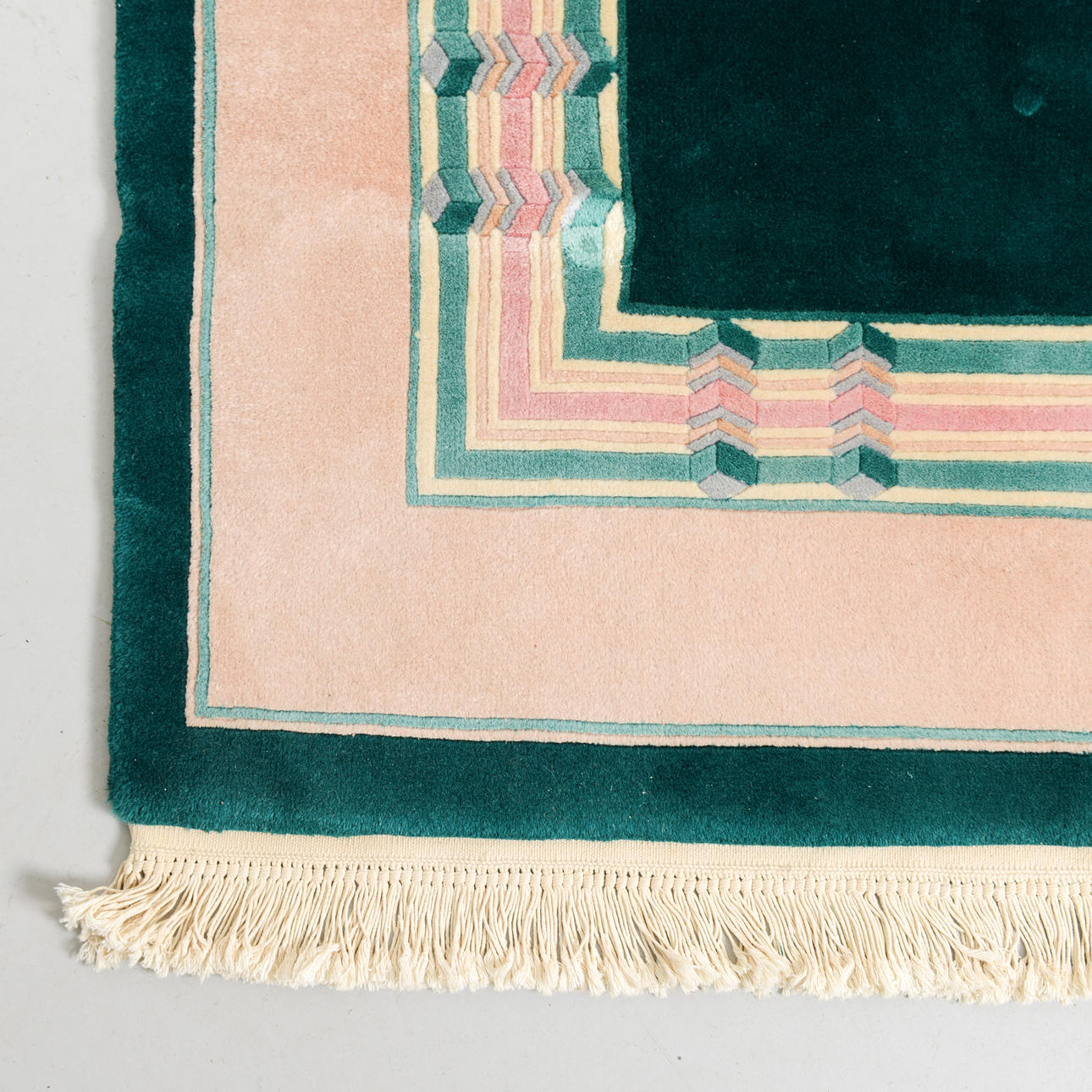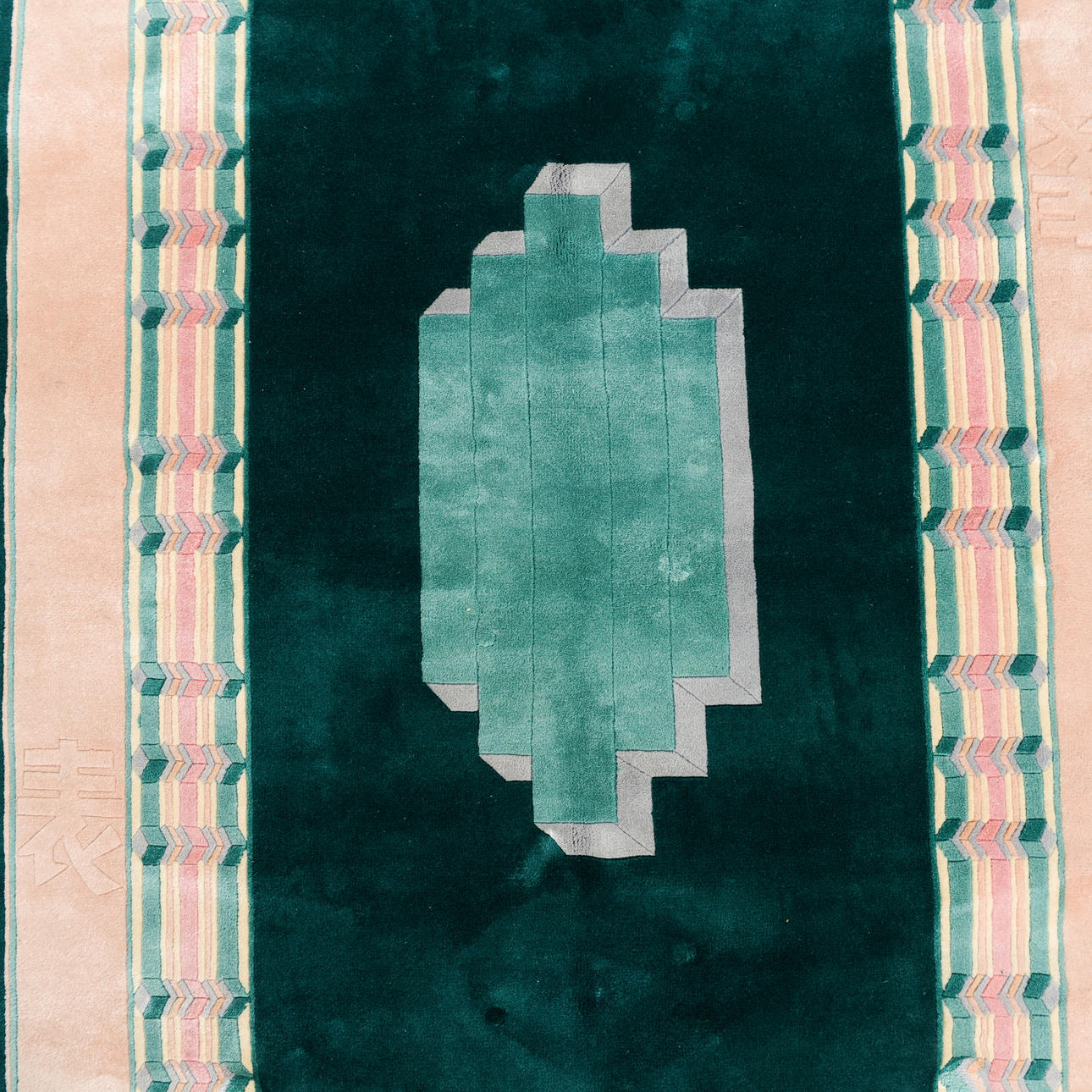 Wool carpet. Dark green central field with a stylized central medallion, surrounded by wide light fields and geometrically constructed borders in pastel tones.