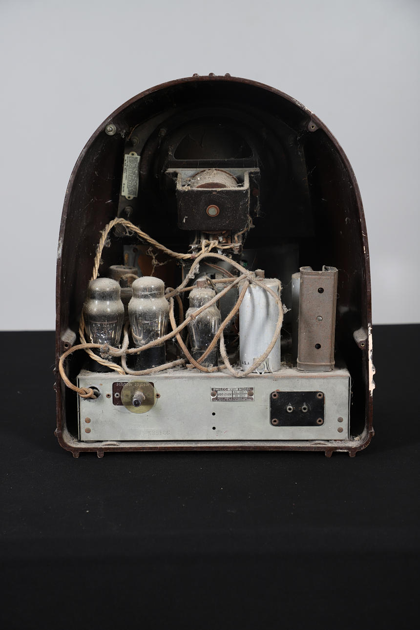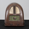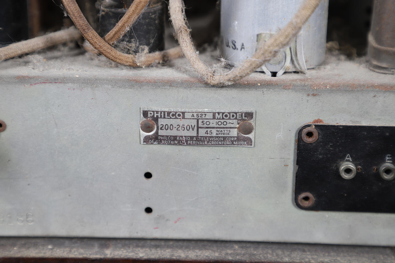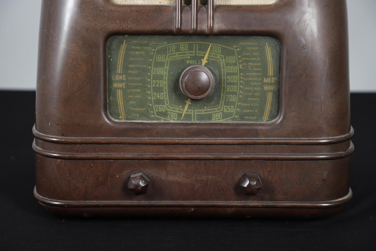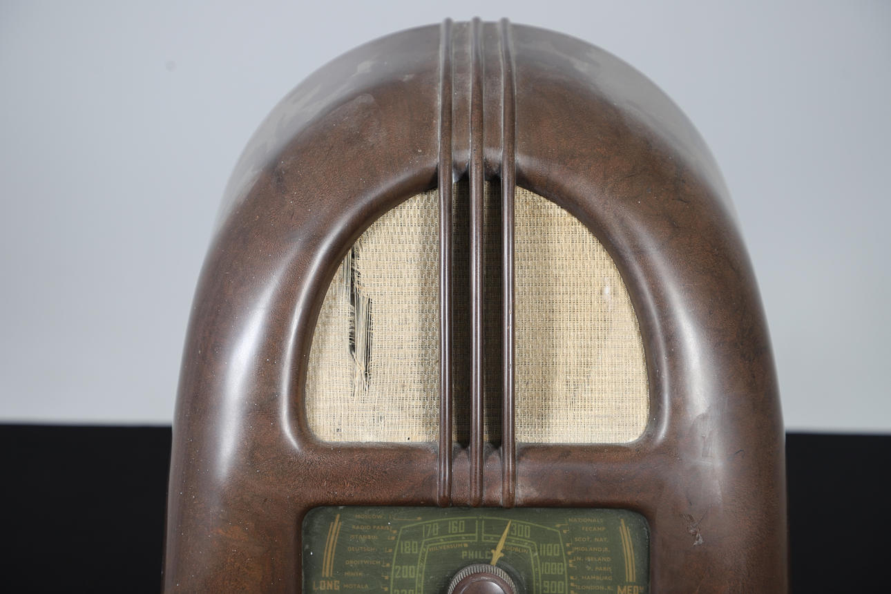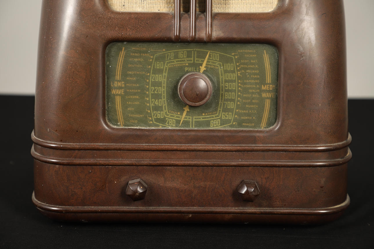 A Philco 1937 Bakelite radio, with a dial for long and medium waves and two others. 40cm (h) x 34cm (w) x 24cm (d).