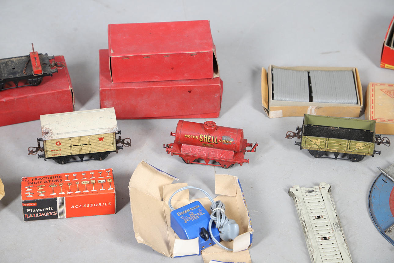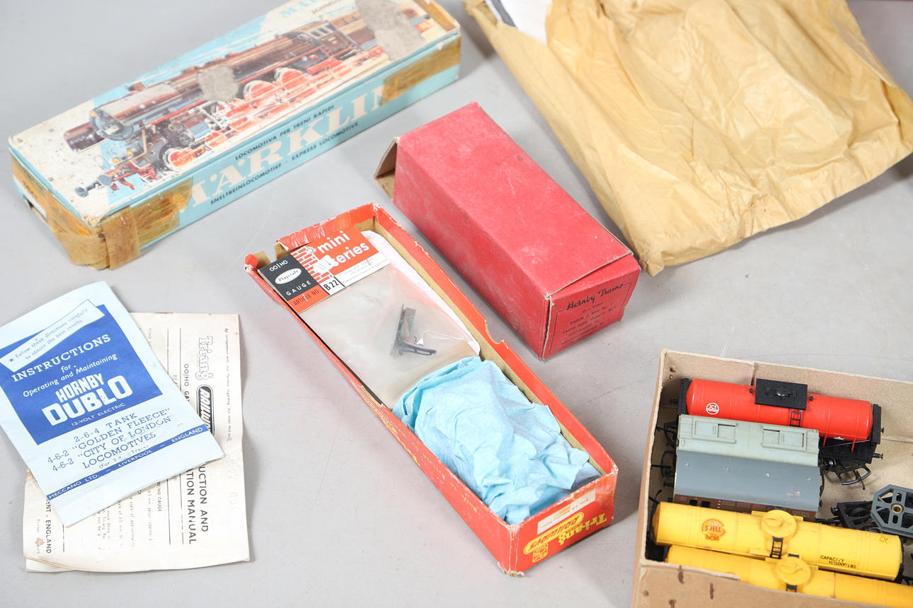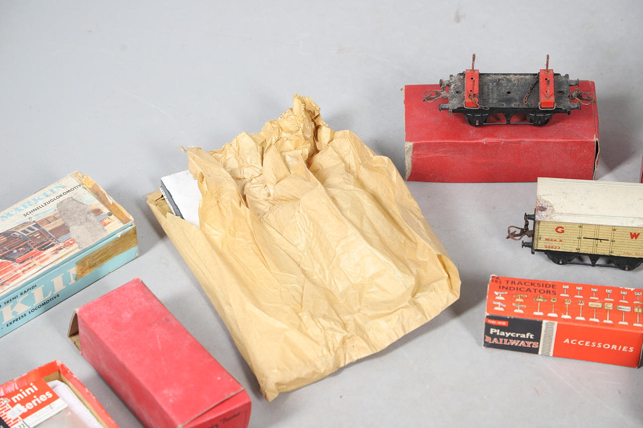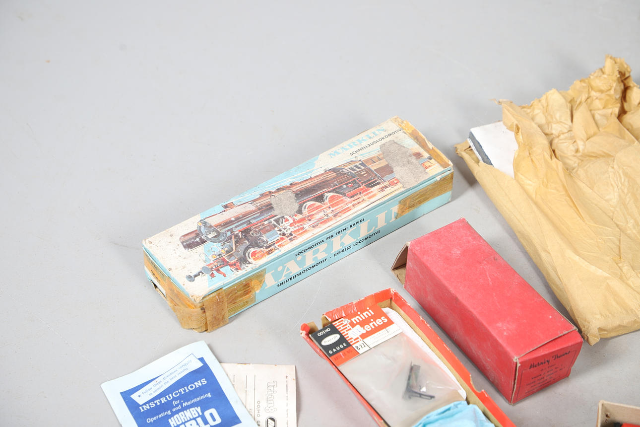 A mixed lot including a boxed Hornby No 40 Tank Locomotive, boxed Refrigerator Van, and other boxed and unboxed Hornby 0 gauge, Marklin loco in a box, and various other railway models and accessories. Box for postage, approx 50cms by 50cms by 40cms.