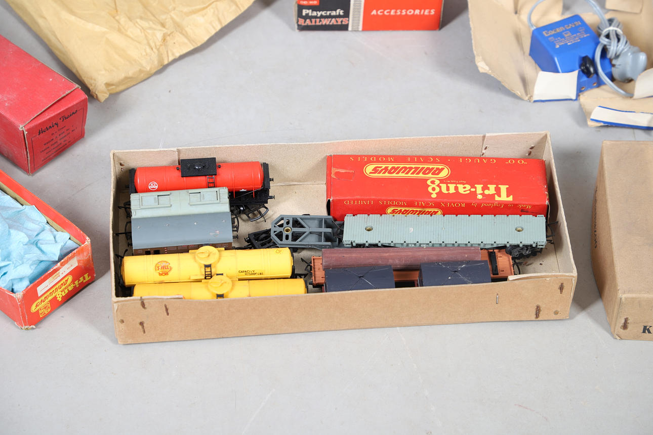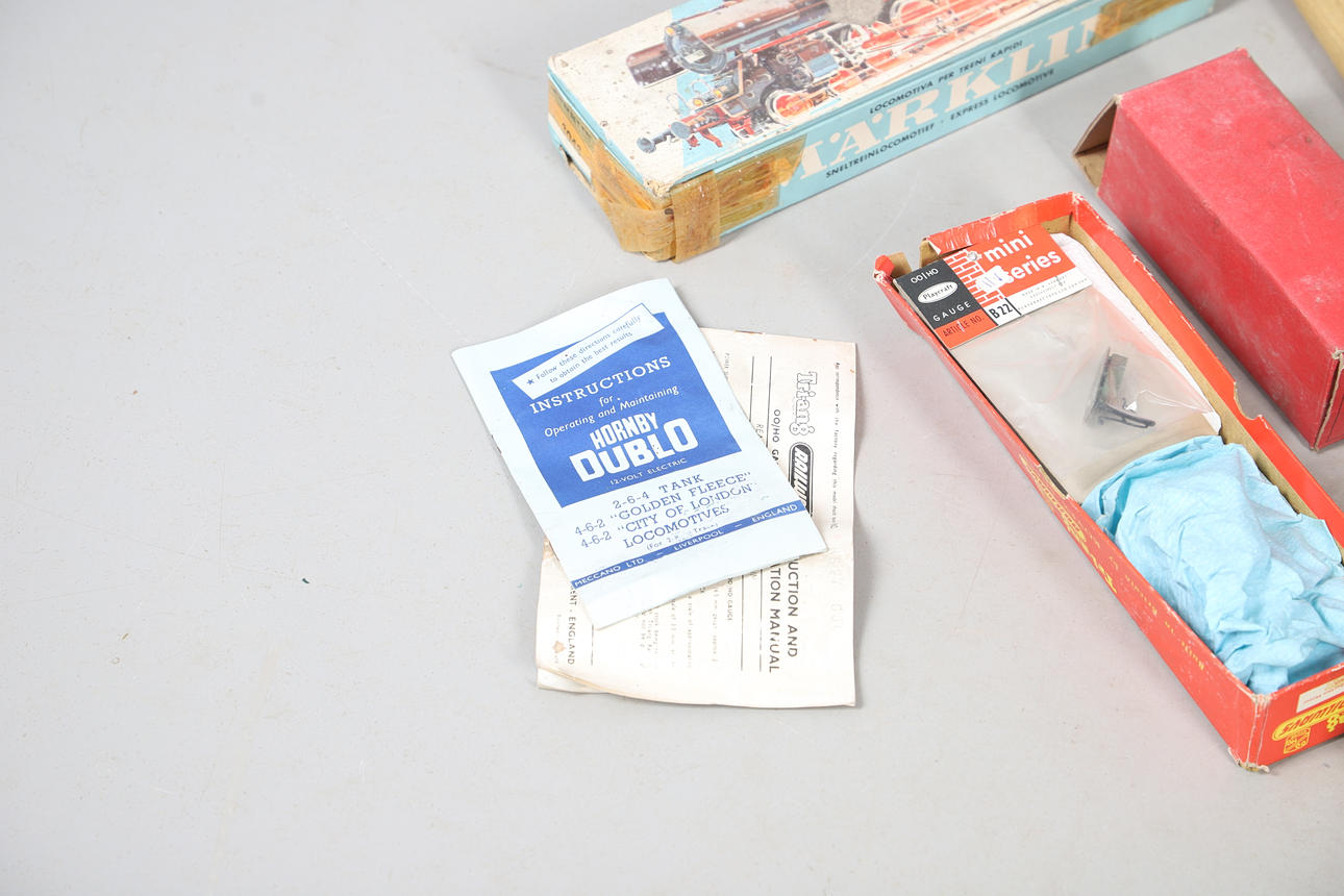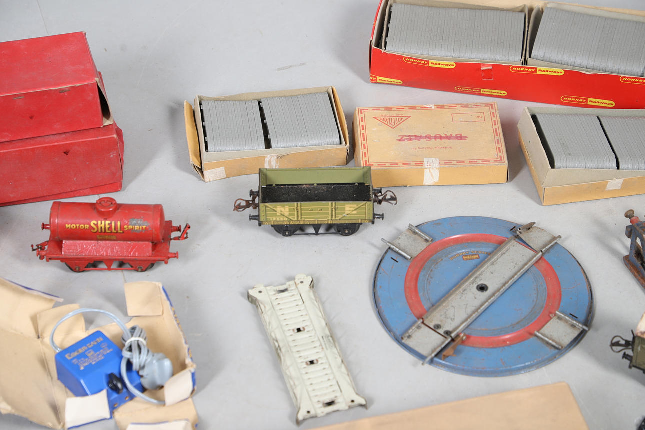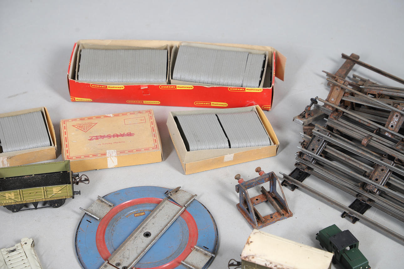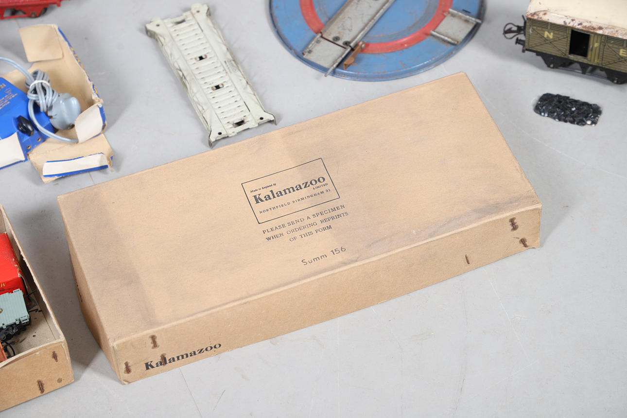A mixed lot including a boxed Hornby No 40 Tank Locomotive, boxed Refrigerator Van, and other boxed and unboxed Hornby 0 gauge, Marklin loco in a box, and various other railway models and accessories. Box for postage, approx 50cms by 50cms by 40cms.