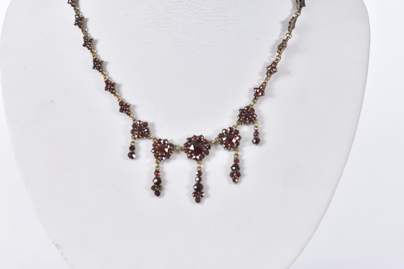 NECKLACE, brass with faceted garnets.