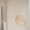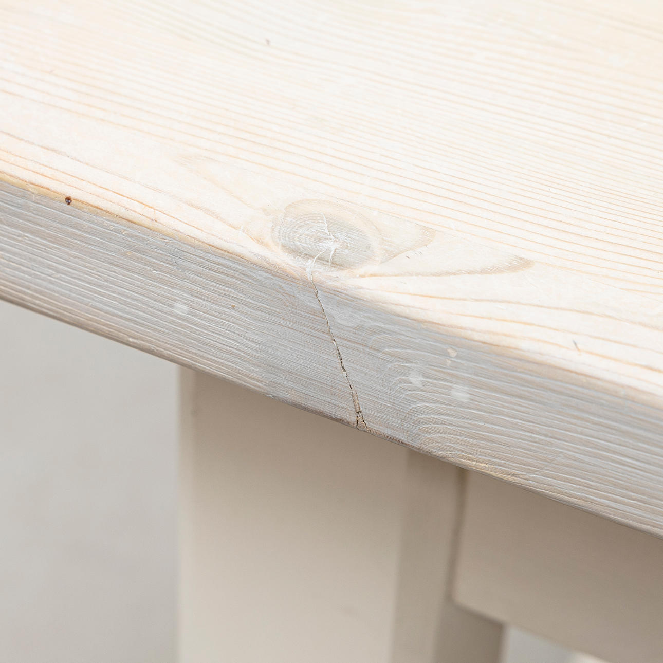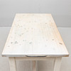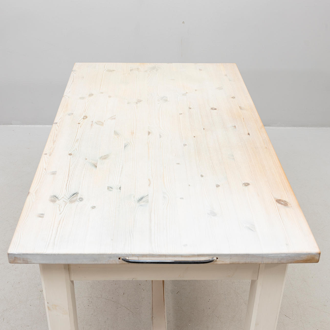 Rustic, white-glazed pine table with a wide apron and straight legs with chamfered corners. Short sides with metal handles.