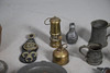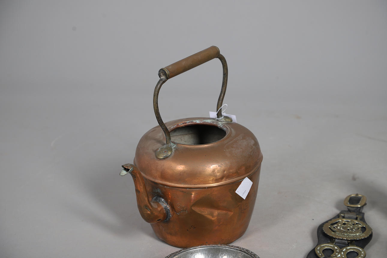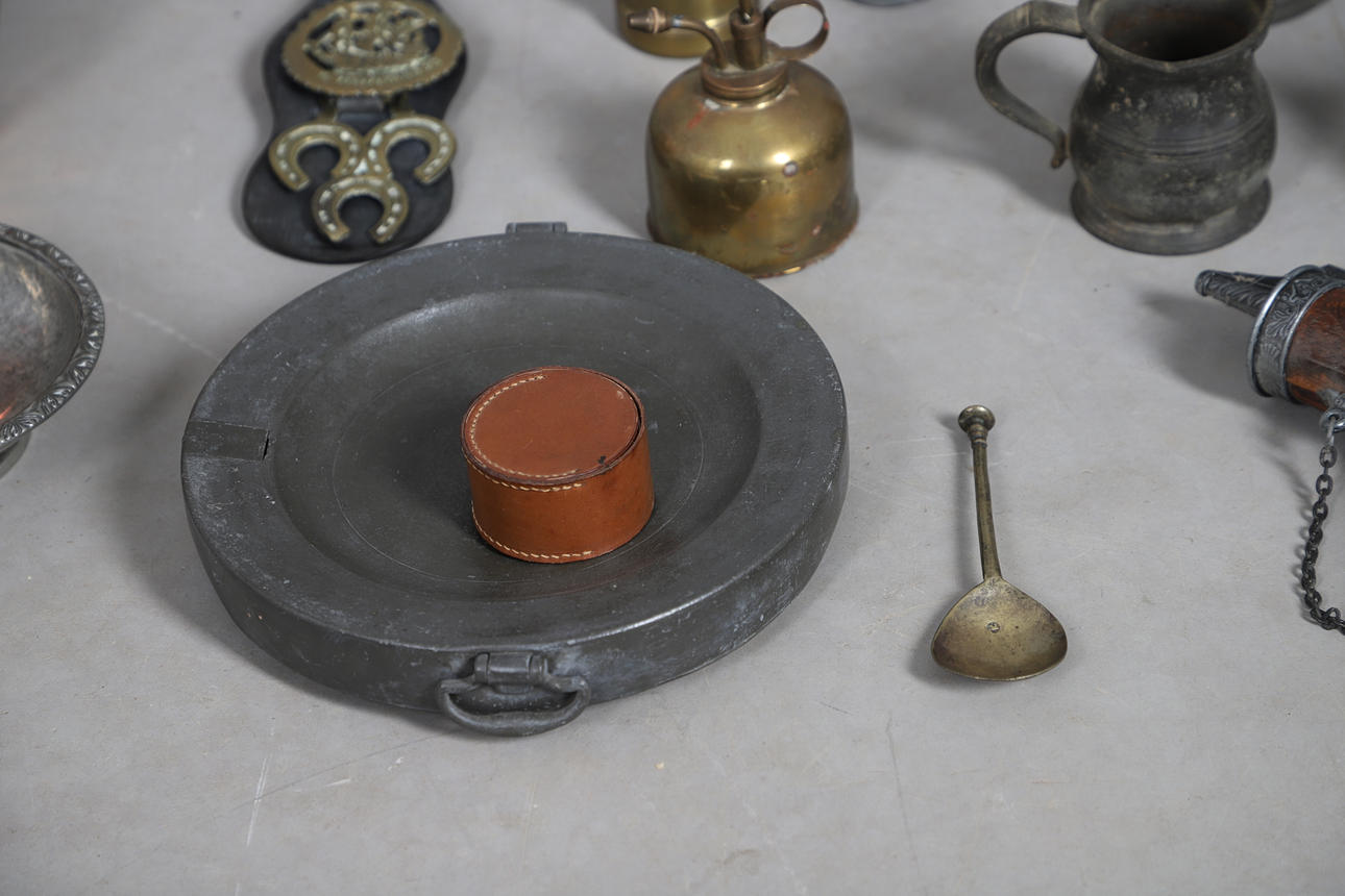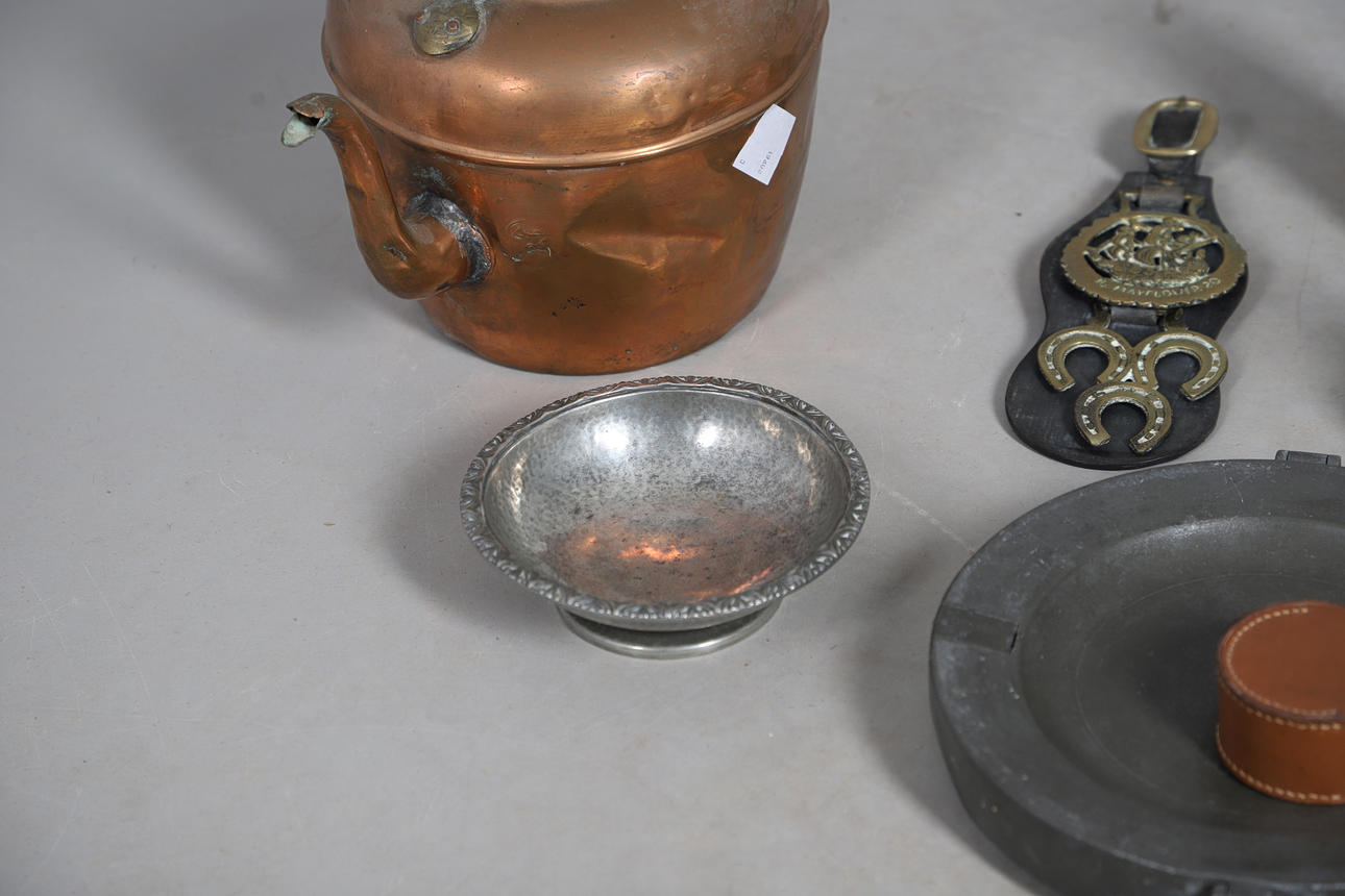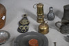 including pewter mugs, inkwell, plate warmer, small brass minor's lamp, 17cm high, Continental pewter mounted powder flask, wooden truncheon, copper kettle, horses brasses etc.
