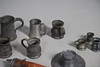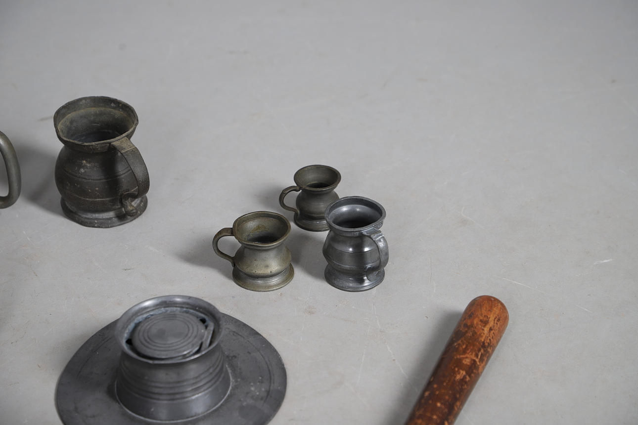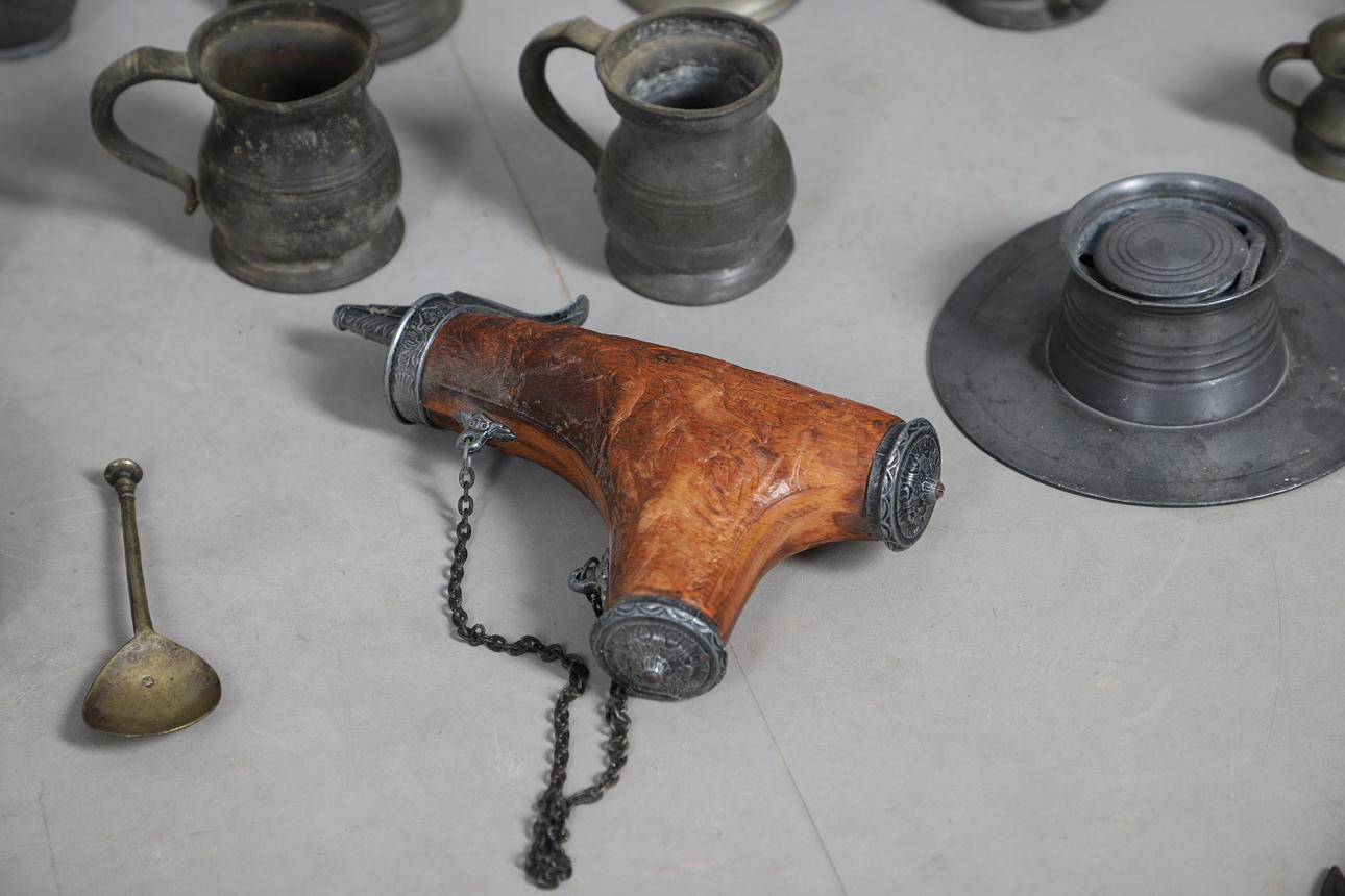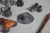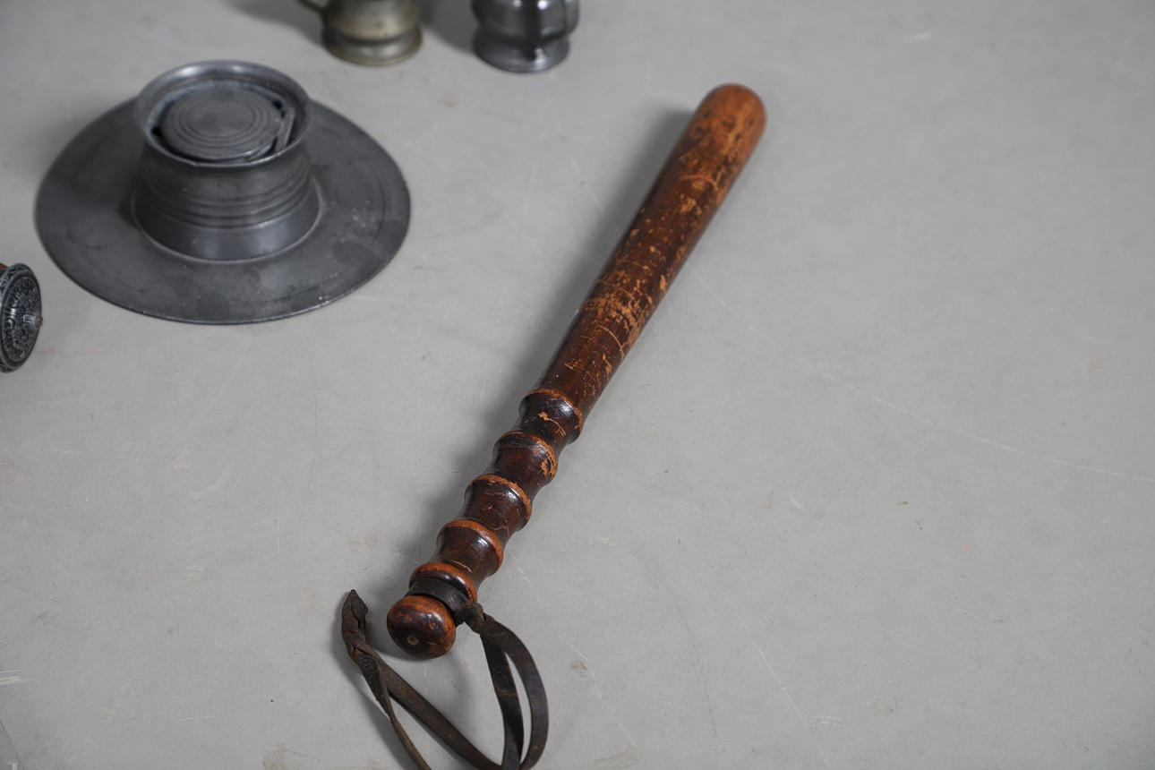 including pewter mugs, inkwell, plate warmer, small brass minor's lamp, 17cm high, Continental pewter mounted powder flask, wooden truncheon, copper kettle, horses brasses etc.