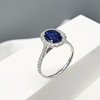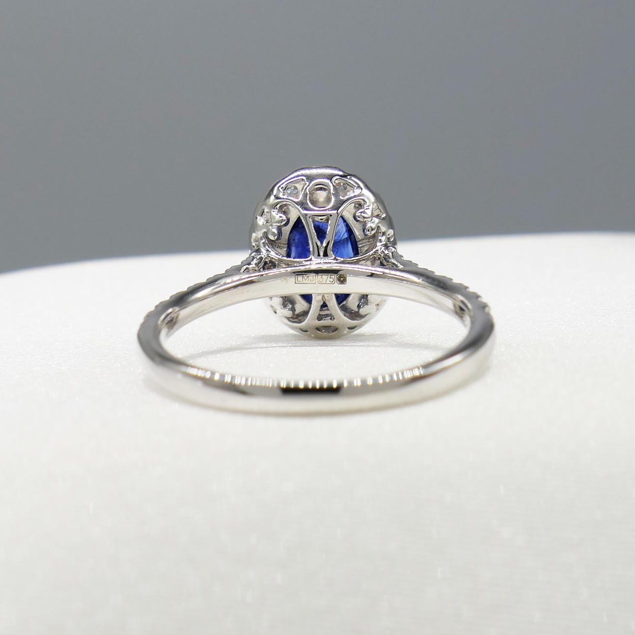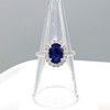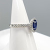 White gold cluster ring, set with a natural sapphire and diamonds to the surrounds and shoulders, boxed