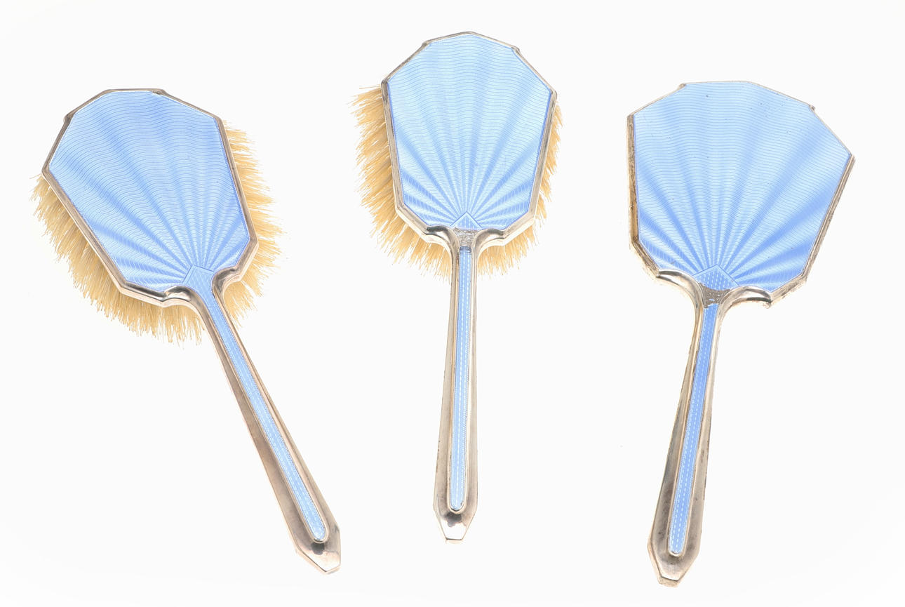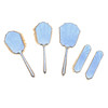 5049987. A SILVER AND BLUE ENAMEL FIVE PIECE DRESSING TABLE SET.