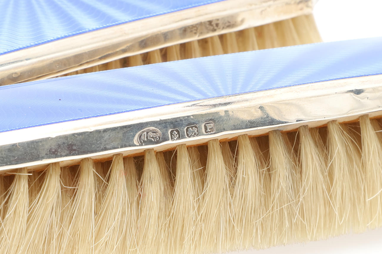 To include a vanity mirror (26cm x 10.5cm) and two pairs of brushes. Hallmarked Alexander Clark & Co Ltd, Birmingham, 1939. (5).