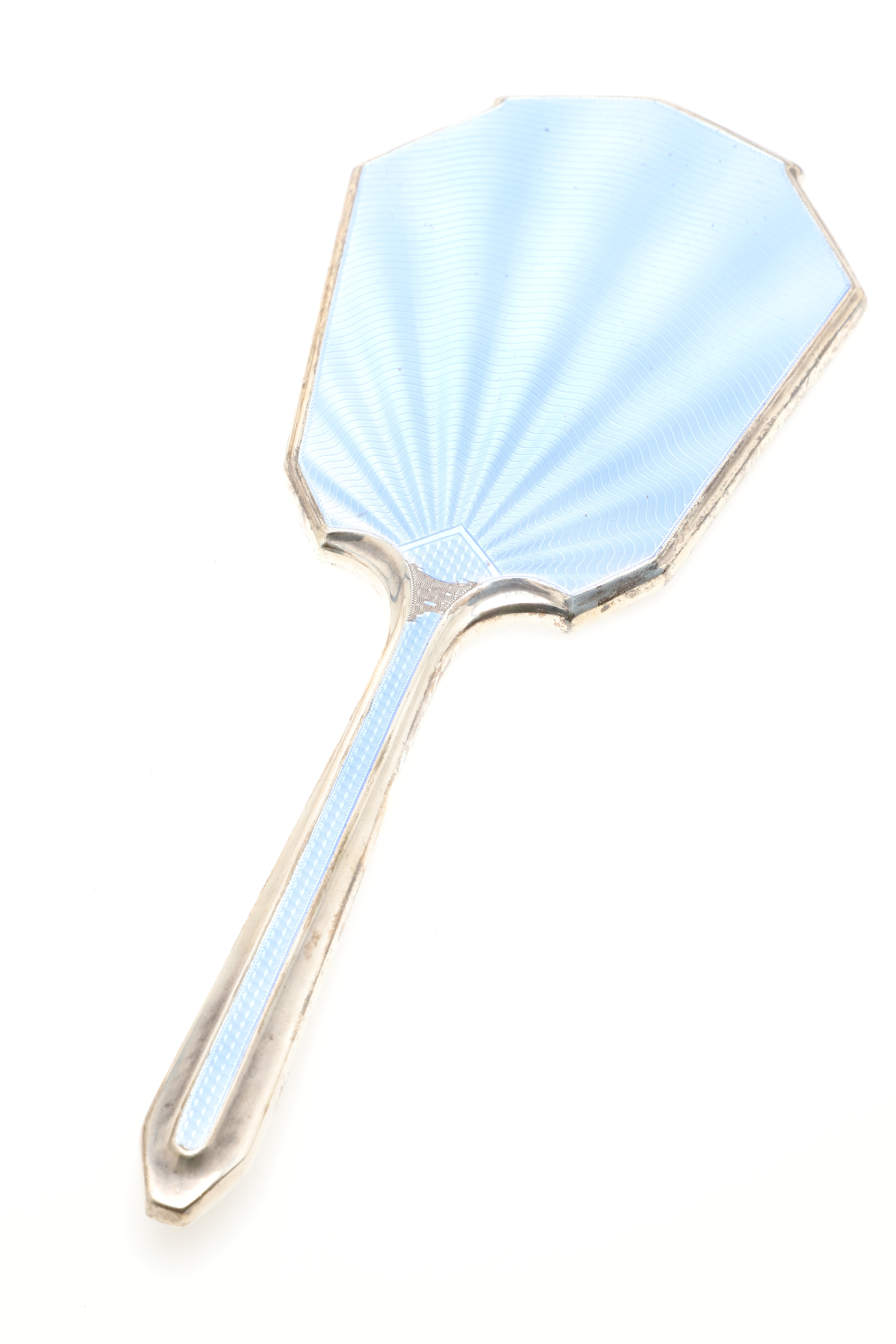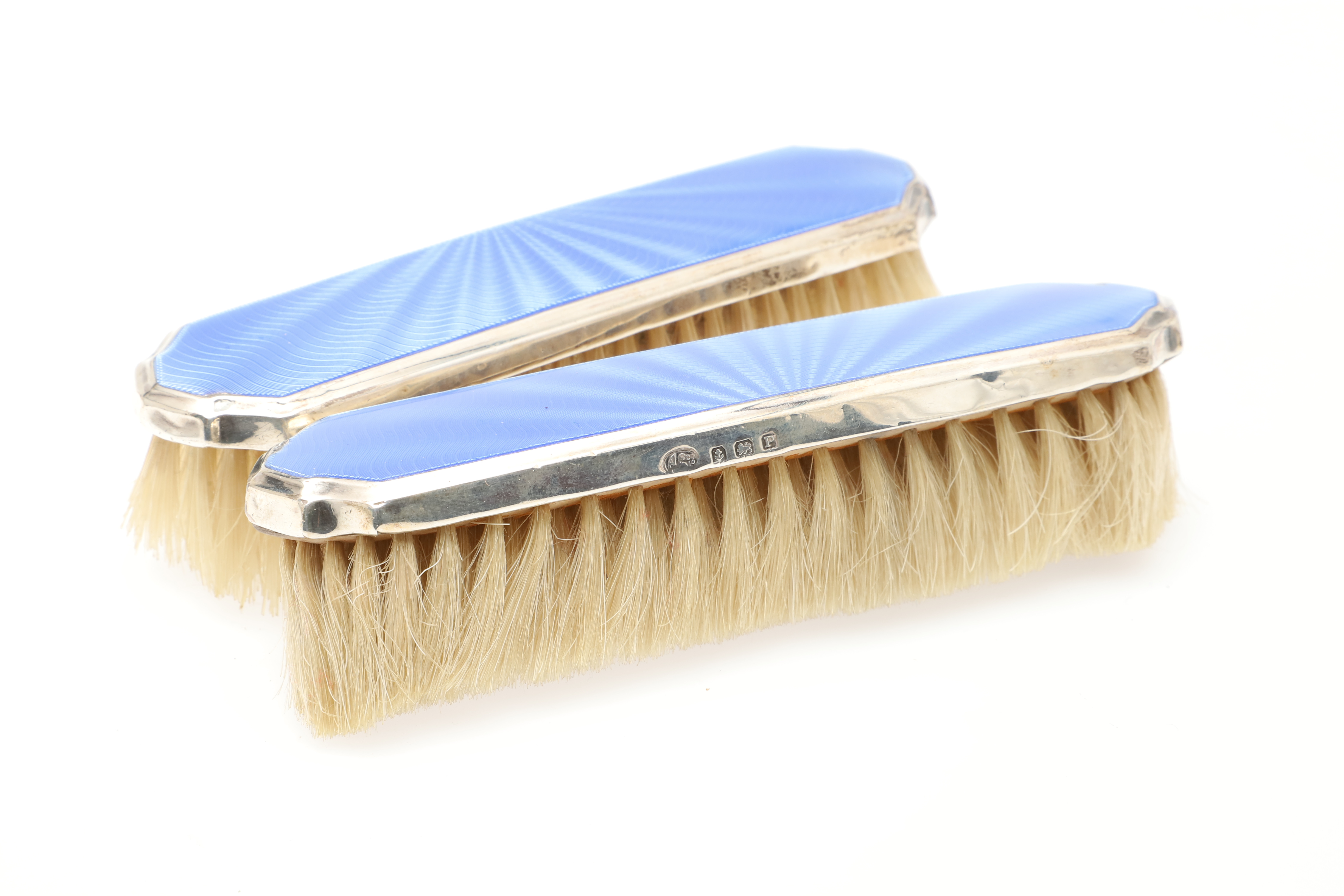 5049987. A SILVER AND BLUE ENAMEL FIVE PIECE DRESSING TABLE SET.