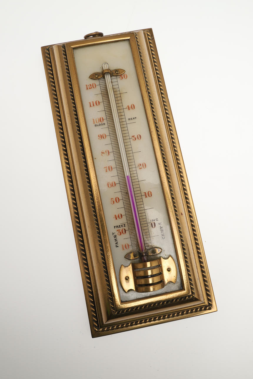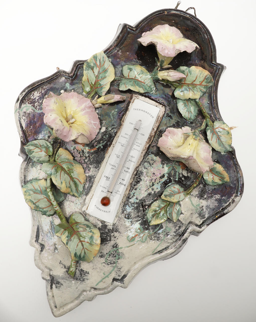 A pottery wall plaque with flowers and leaves in high relief, with a thermometer in the centre (36.5cms high), also with a brass framed thermometer (31cms high). (2).