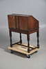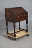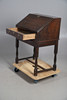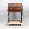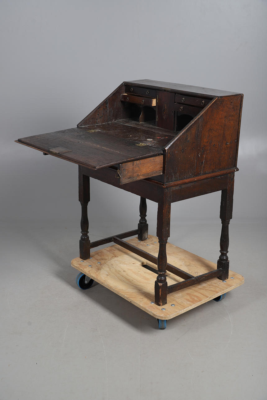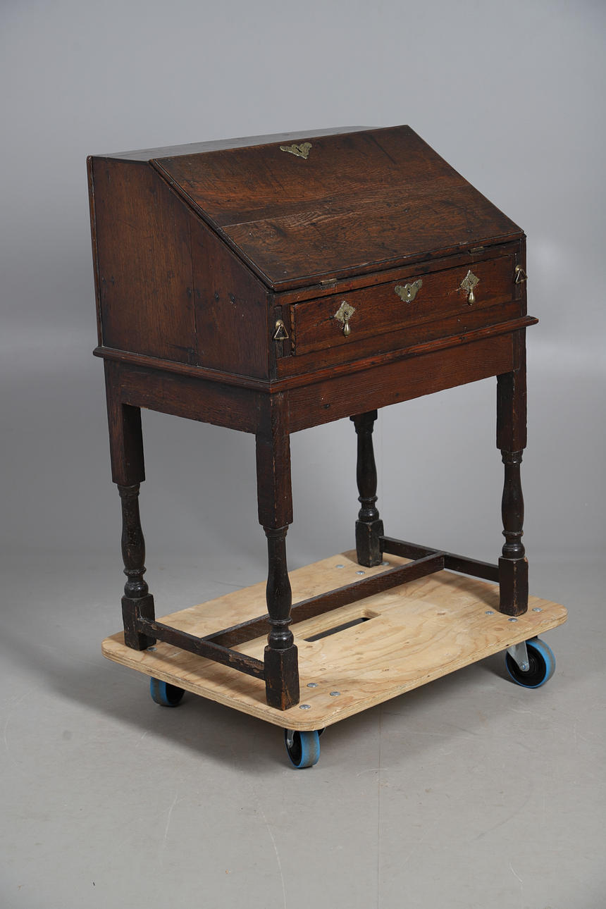 An oak clerk's desk, with a fall front writing service revealing four pigeon holes, four drawers and an inlaid cupboard door, above a single drawer with brass drop handles and escutcheons, and raised on turned supports and a H stretcher. 96cm (h) x 73cm (w) x 48.5cm (d).