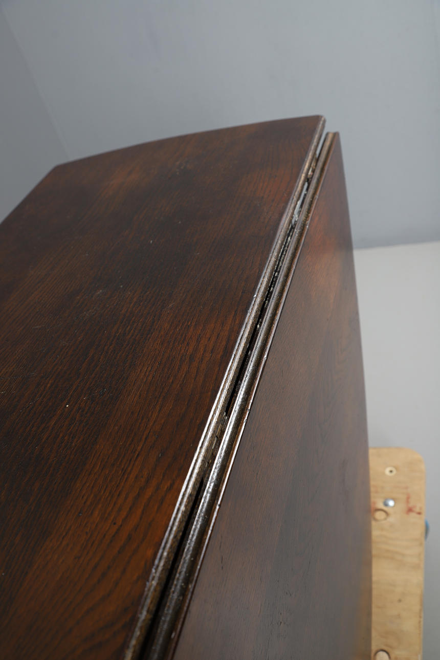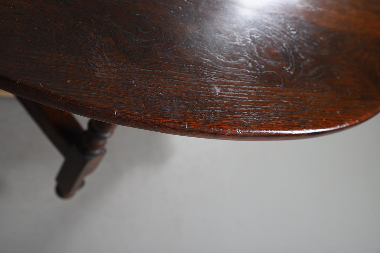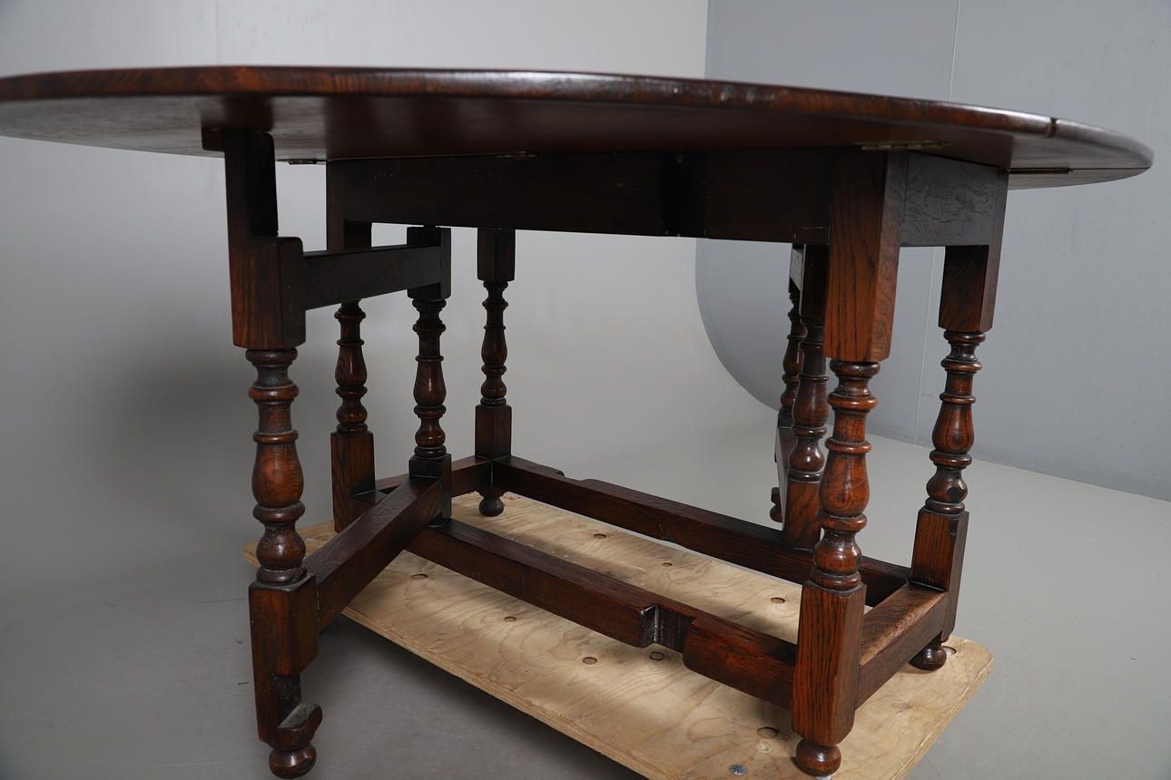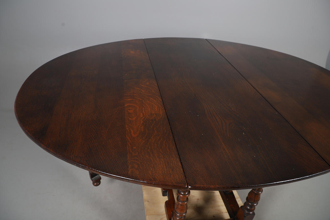 An oak gate leg table, raised on tuned supports and bun feet. Collapsed measurements, 73cm (h) x 134.5cm x 50cm (each leaf adds 62.5cm).