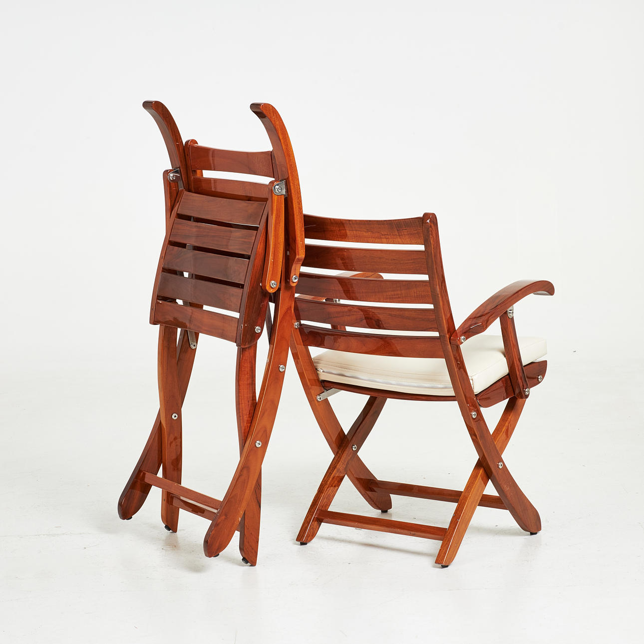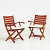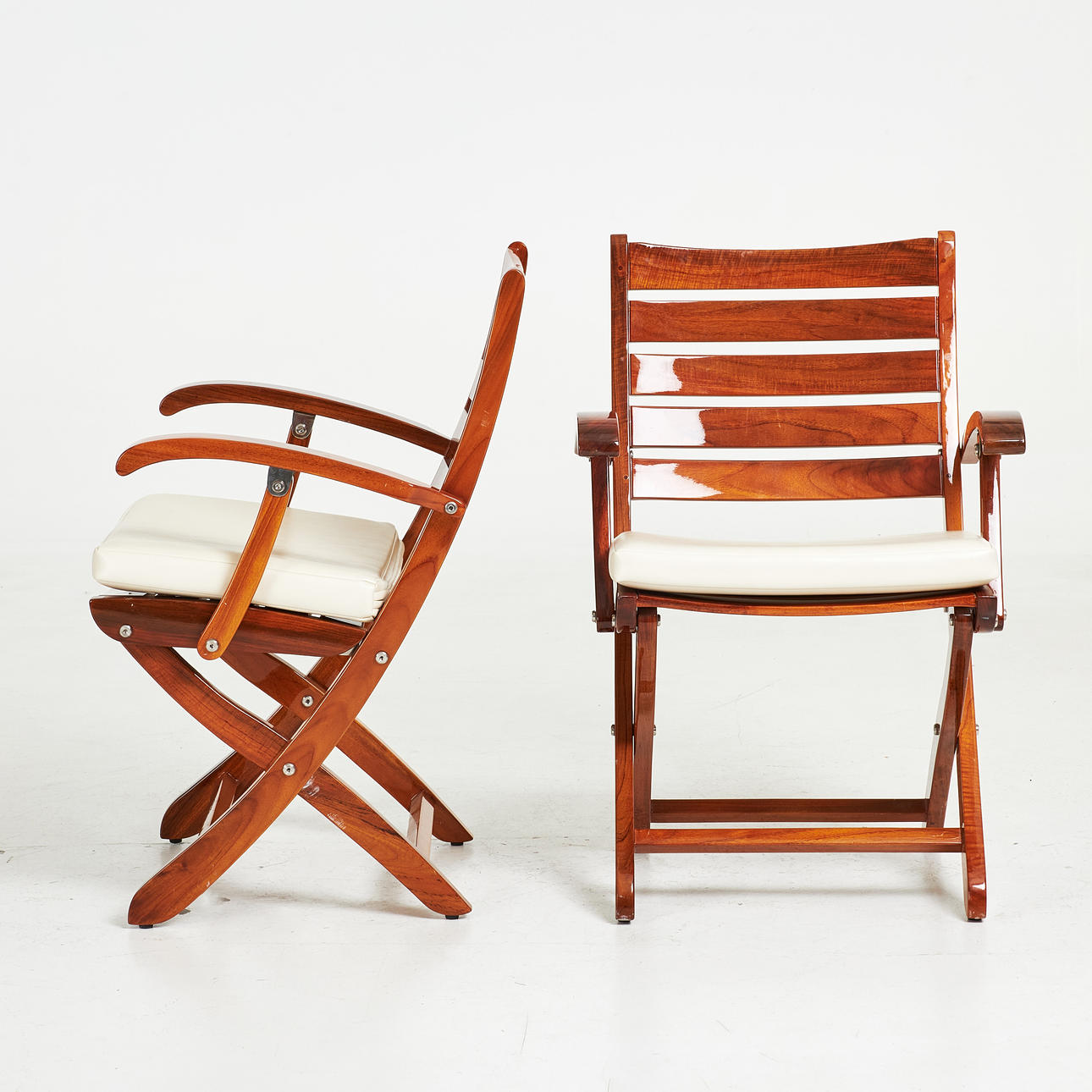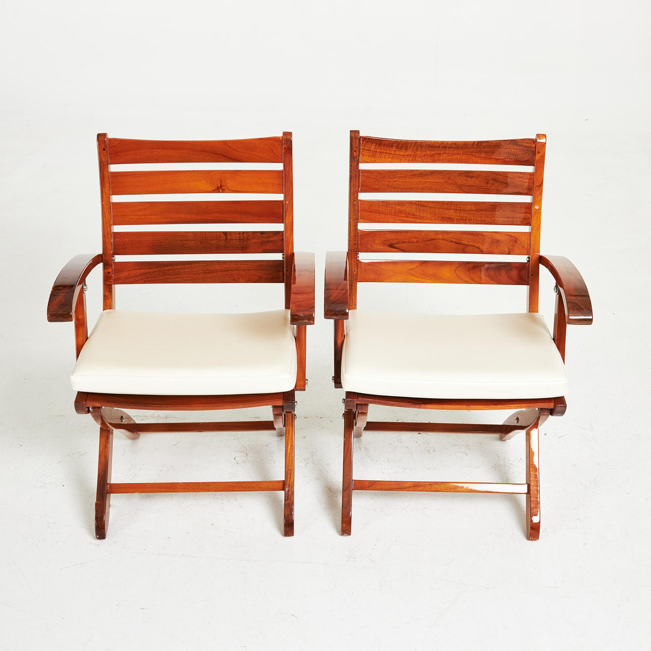 5051351. CAPTAIN'S CHAIRS / DECK CHAIRS, a pair, clear-lacquered solid mahogany, foldable.