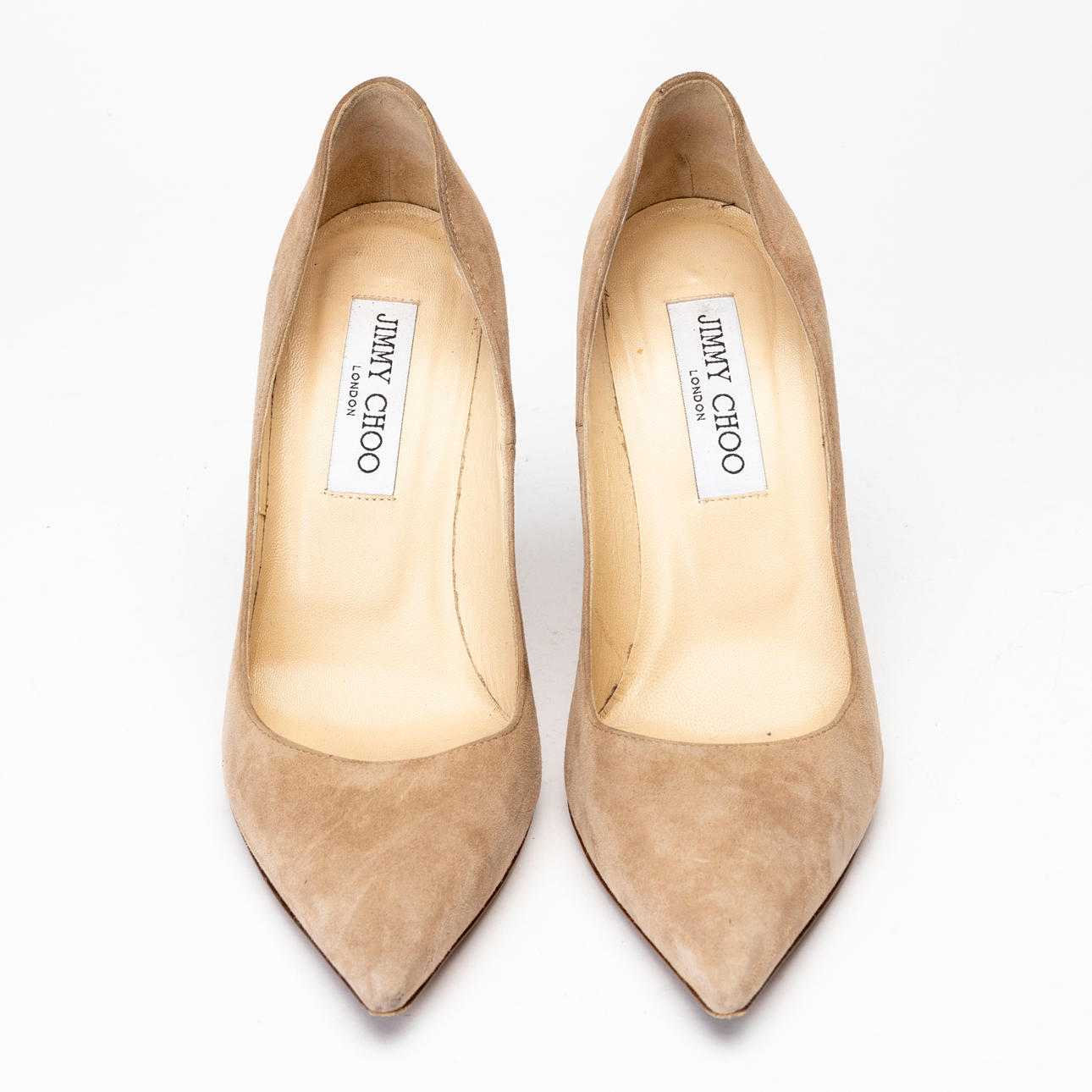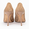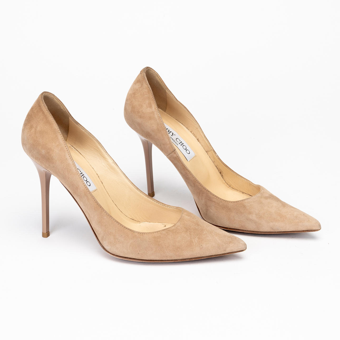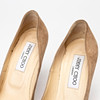 Beige suede pumps with stiletto heels in matching plastic, height 10 cm. Leather lined, marked "JIMMY CHOO LONDON", marked size 36 1/2.