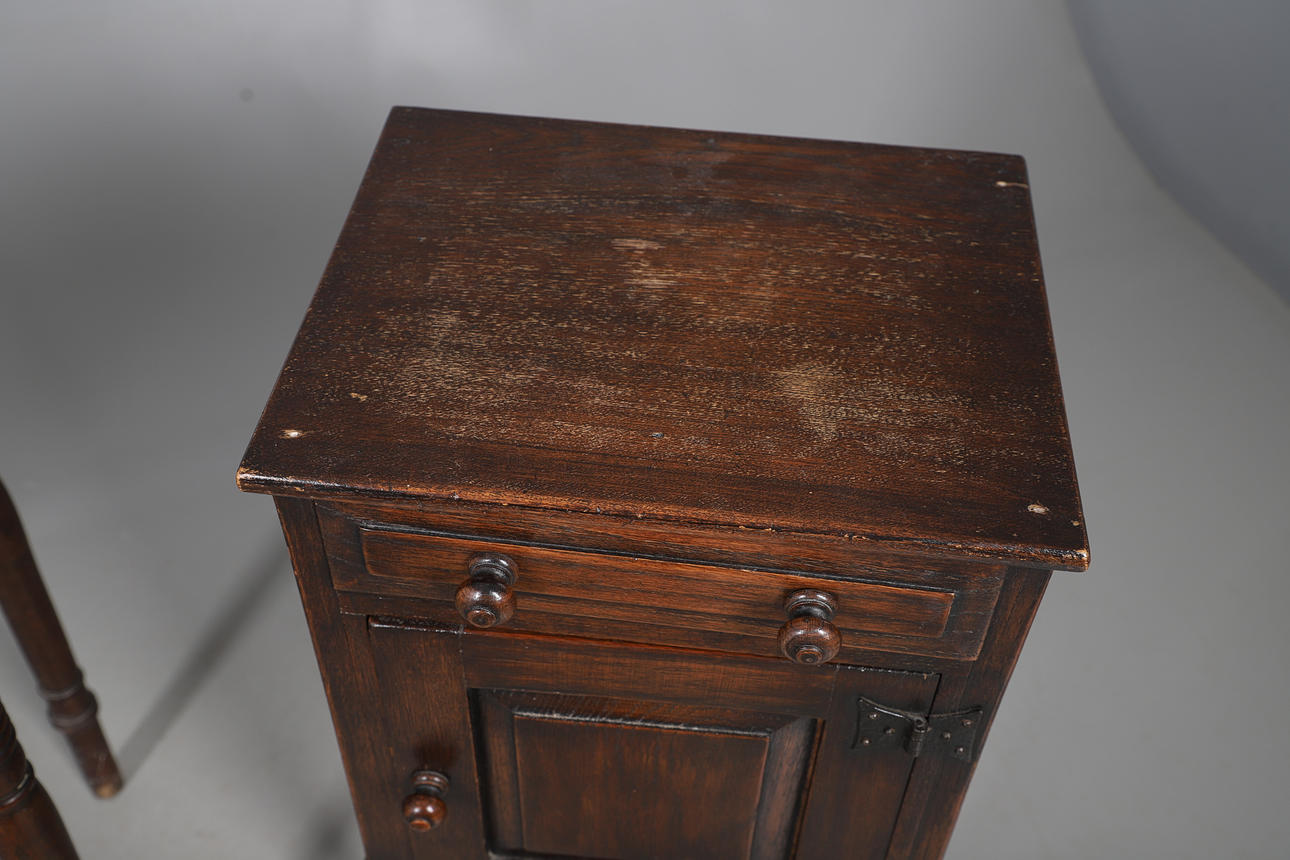 To include an oak pot cupboard, with a single drawer and cupboard door, raised on turned supports, 80cm (h) x 38cm (w) x 30.5cm (d). Together with another cupboard with an open shelf and a single cupboard door revealing a shelf, also with a small hall table. (3).