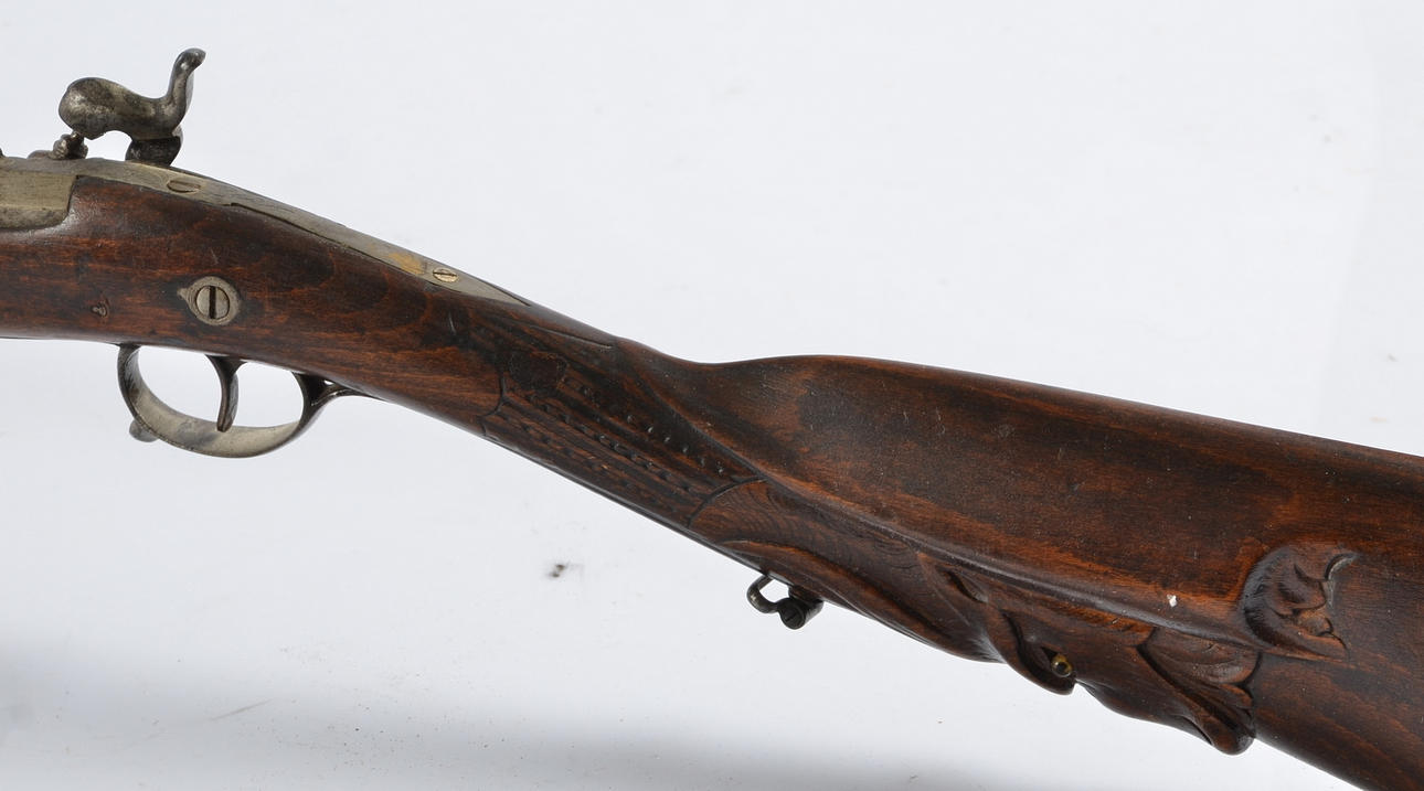 Half-stock, sculpted butt in the shape of a buck's head.