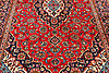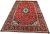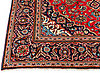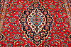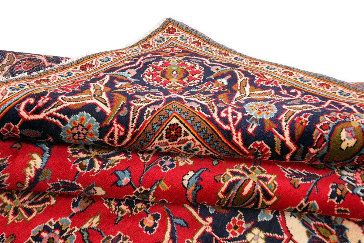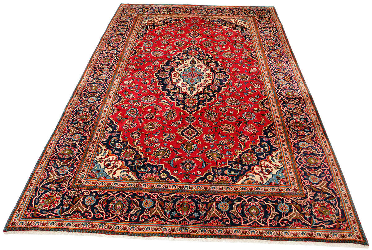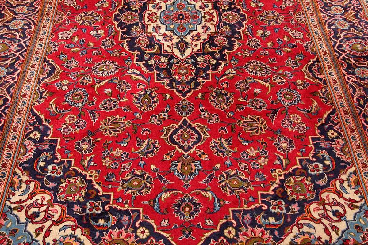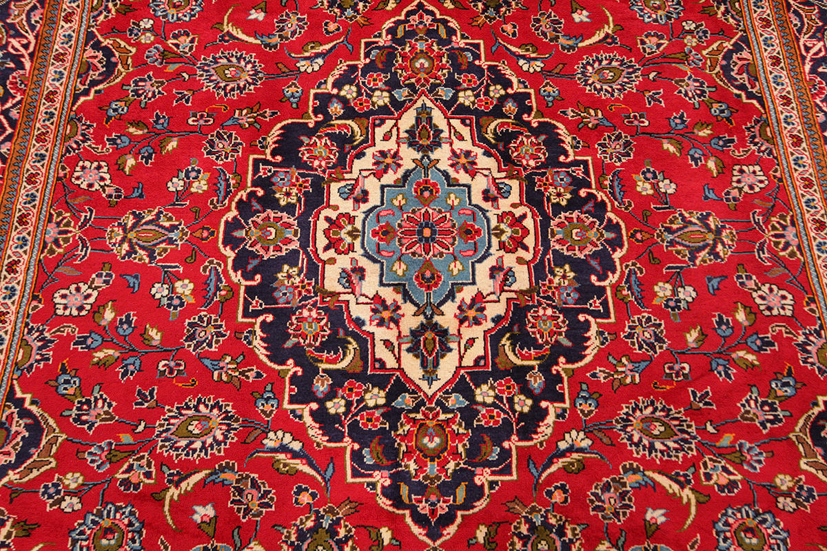 Carpet in wool from the Kashan province. Central medallion with pendants. Stylized polychrome floral decor against a red background, blue main border.