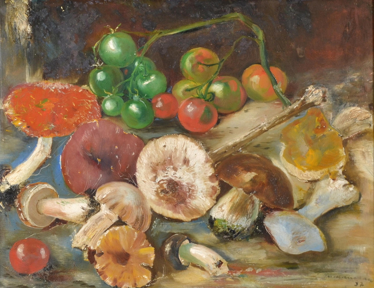 "Still life with gnomes and mushrooms", signed and dated -37.