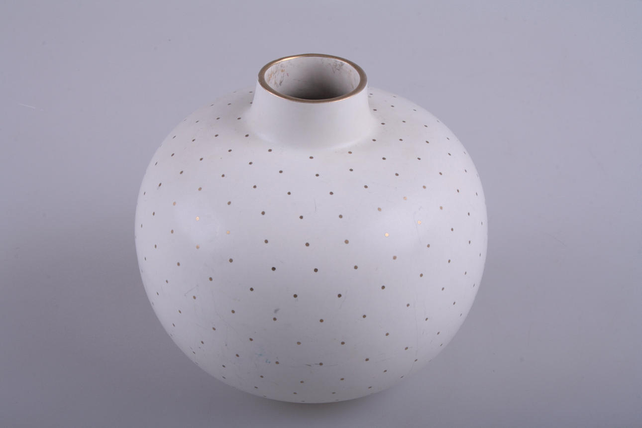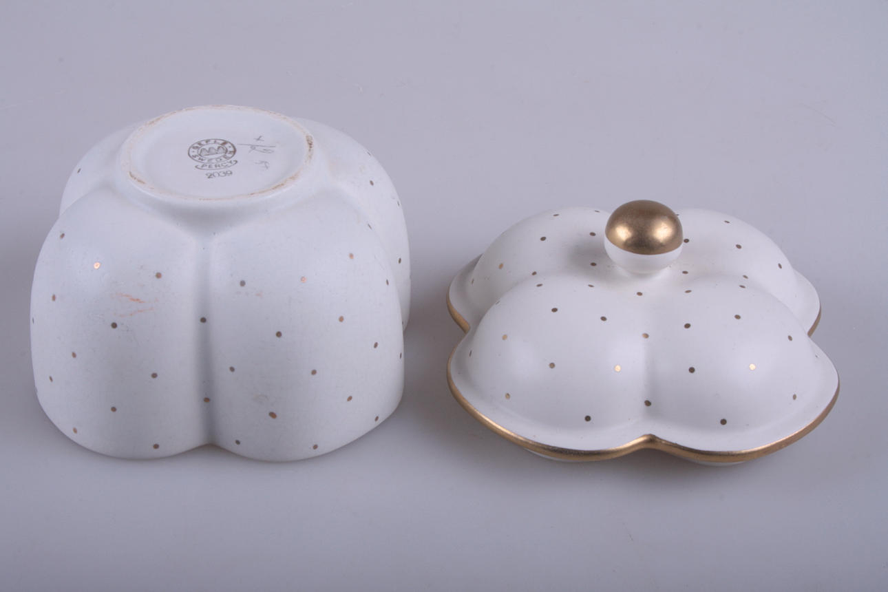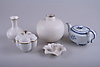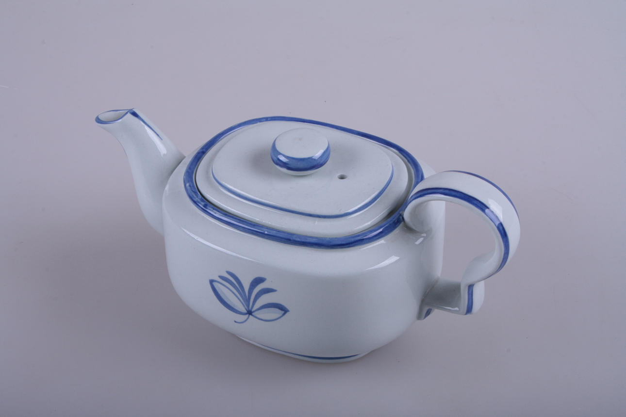 Vase decor 2039, model YU height approx. 15.5 cm Vase decor 2039, model DB height approx. 16 cm, ø 17 cm Bonbonjär, decor 2039, height approx. 11.5 cm with cover, 7 cm without Candlestick, decor 2039, approx. 14 cm Coffee pot, Blue Band, "150 3", height approx. 11.5 cm, length approx. 23.5 cm, width approx. 12 cm.