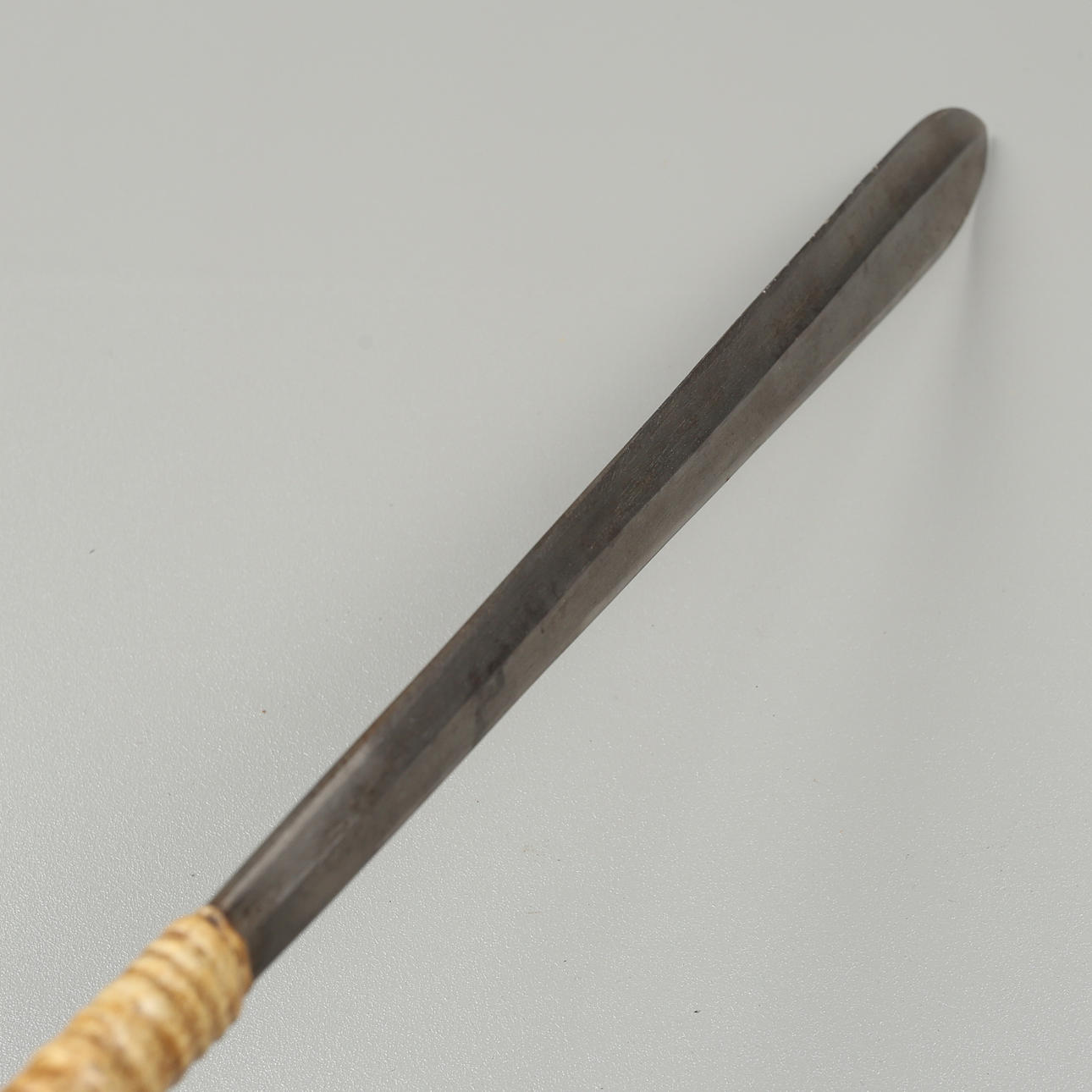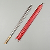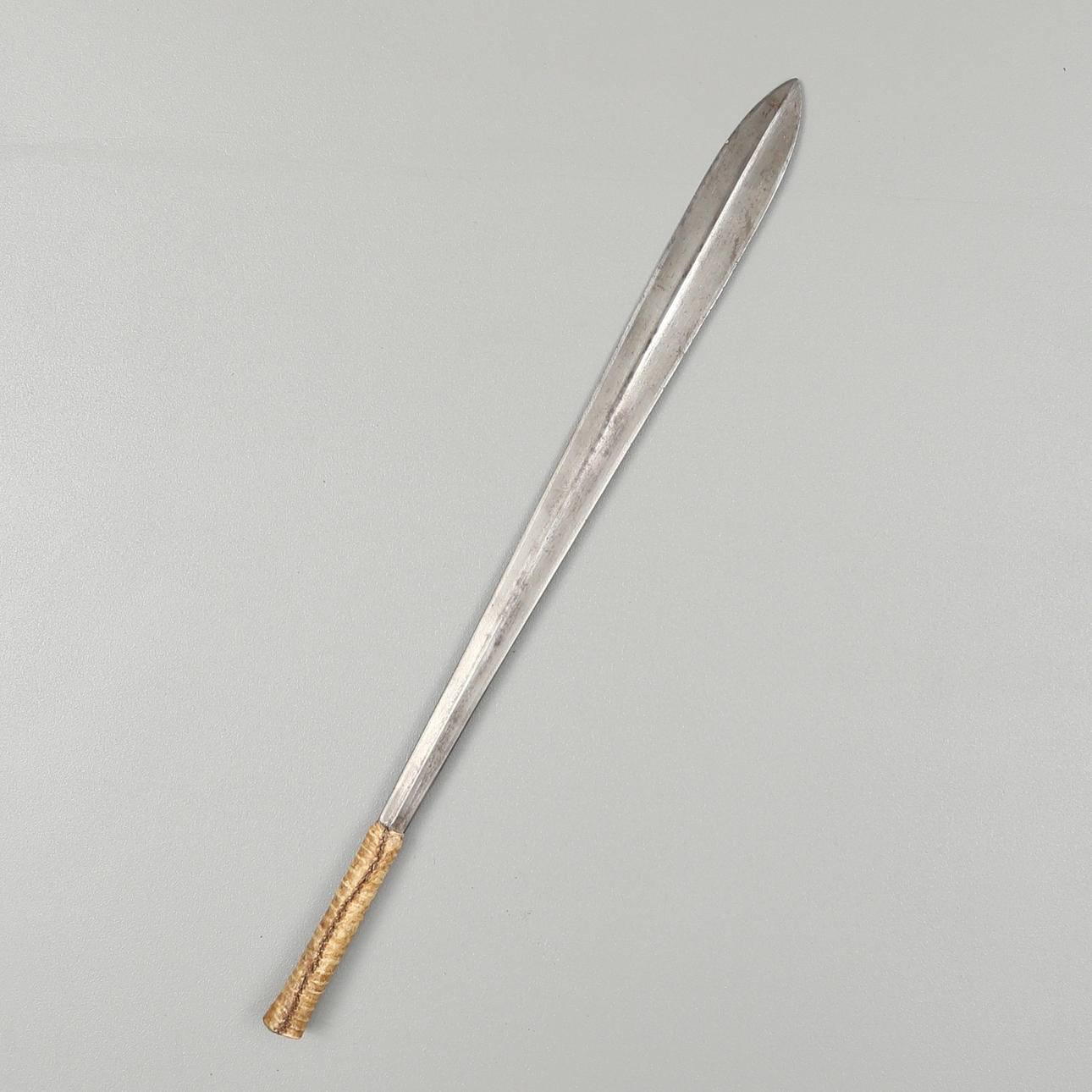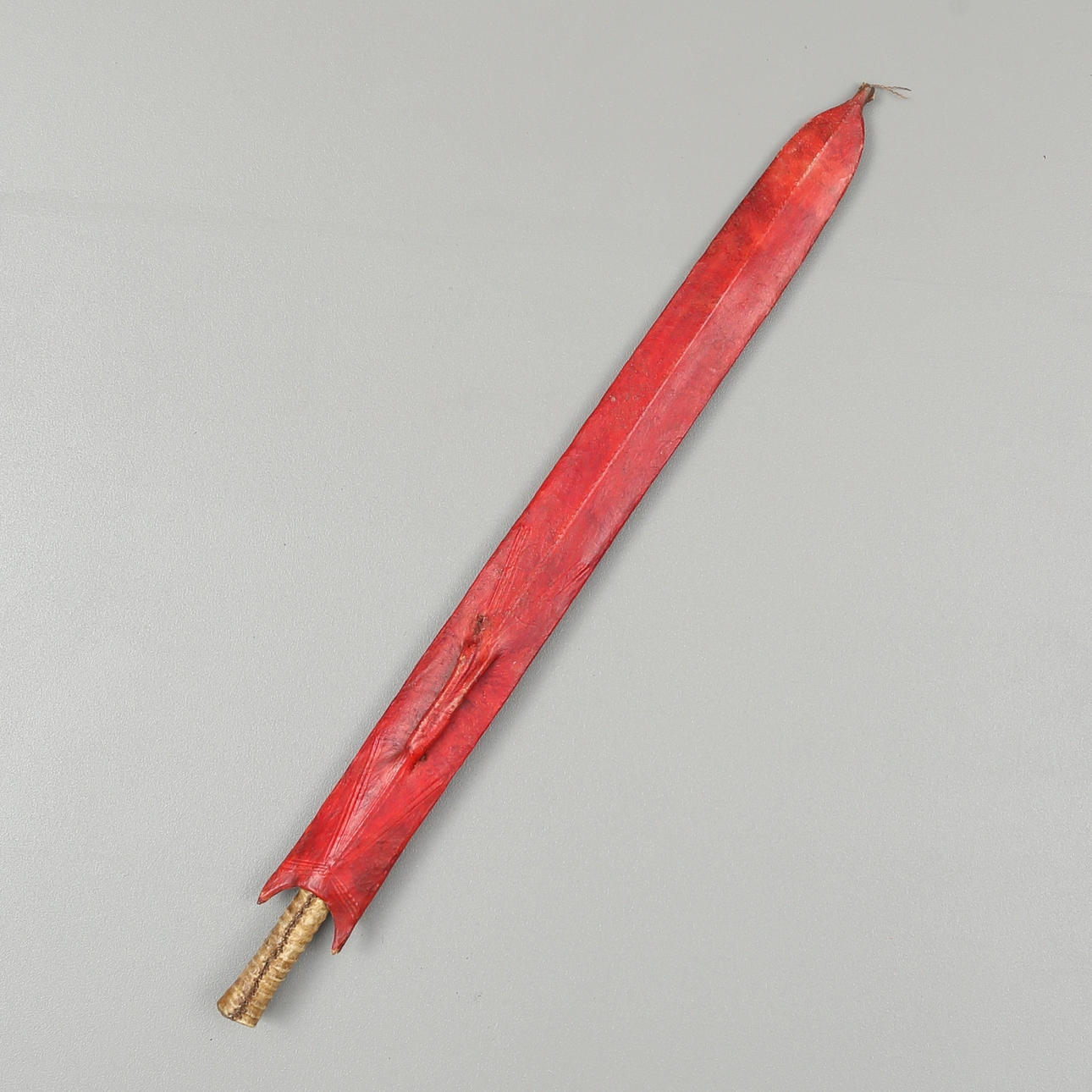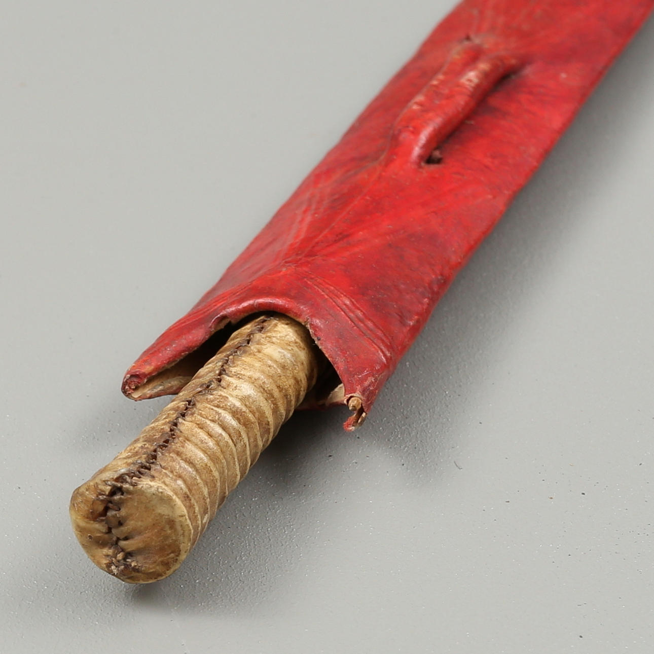 Length 64 cm, strong blade with marked center ridge, leather-covered red scabbard.