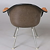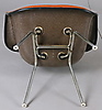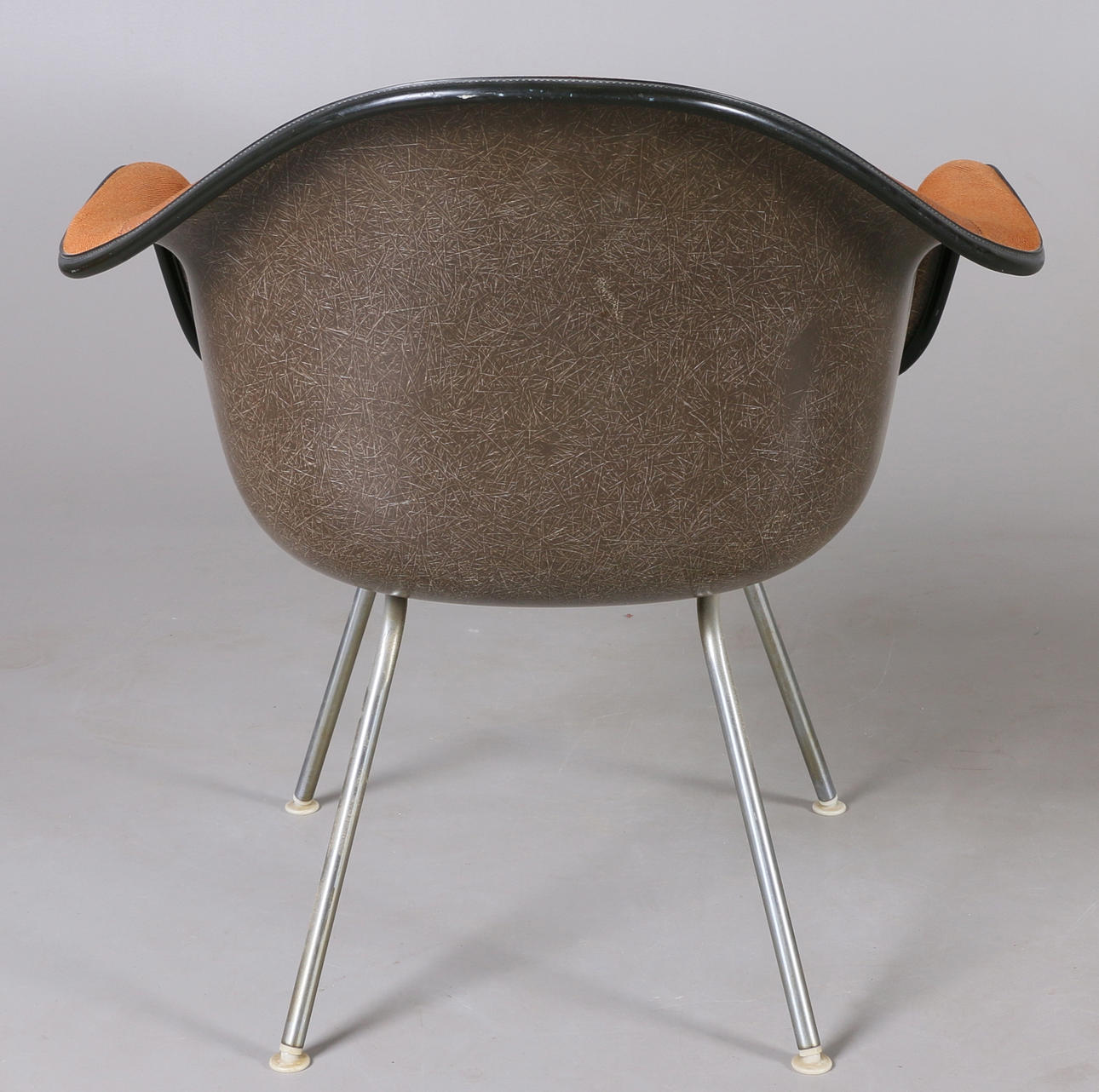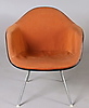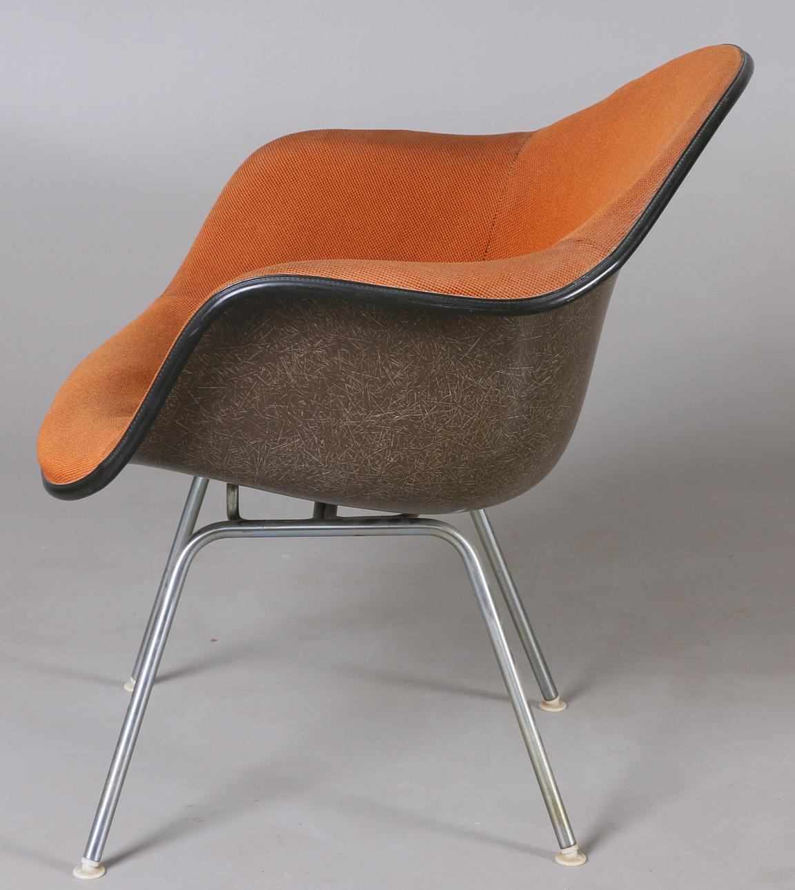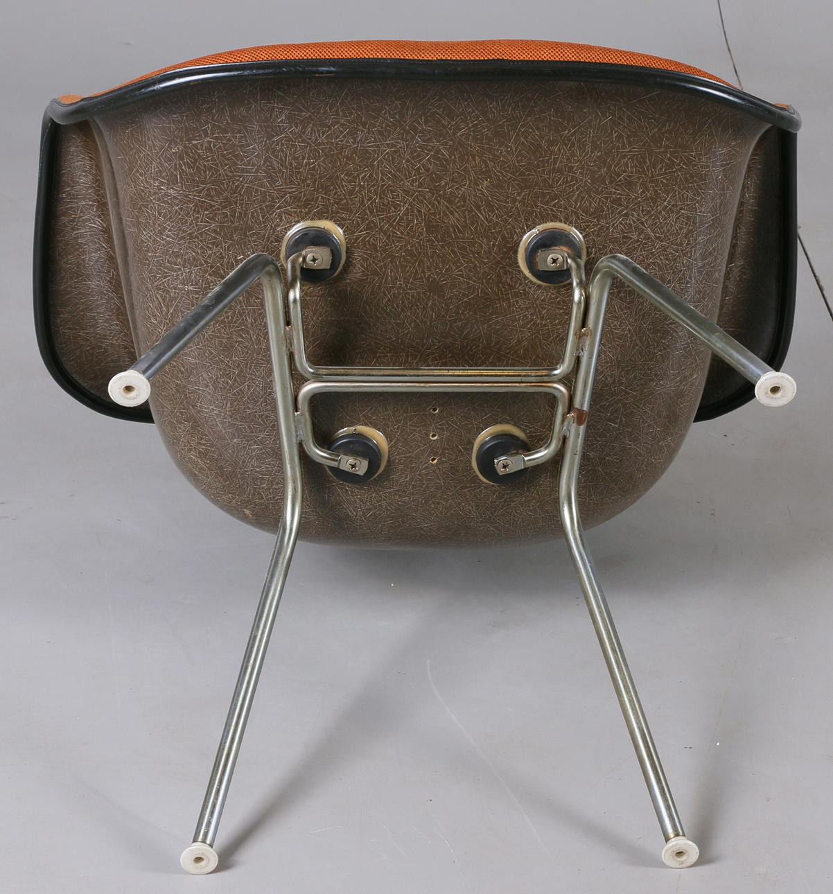 Seats made of molded fiberglass with textile upholstery. Leg support in metal. Backrest height 71 cm.