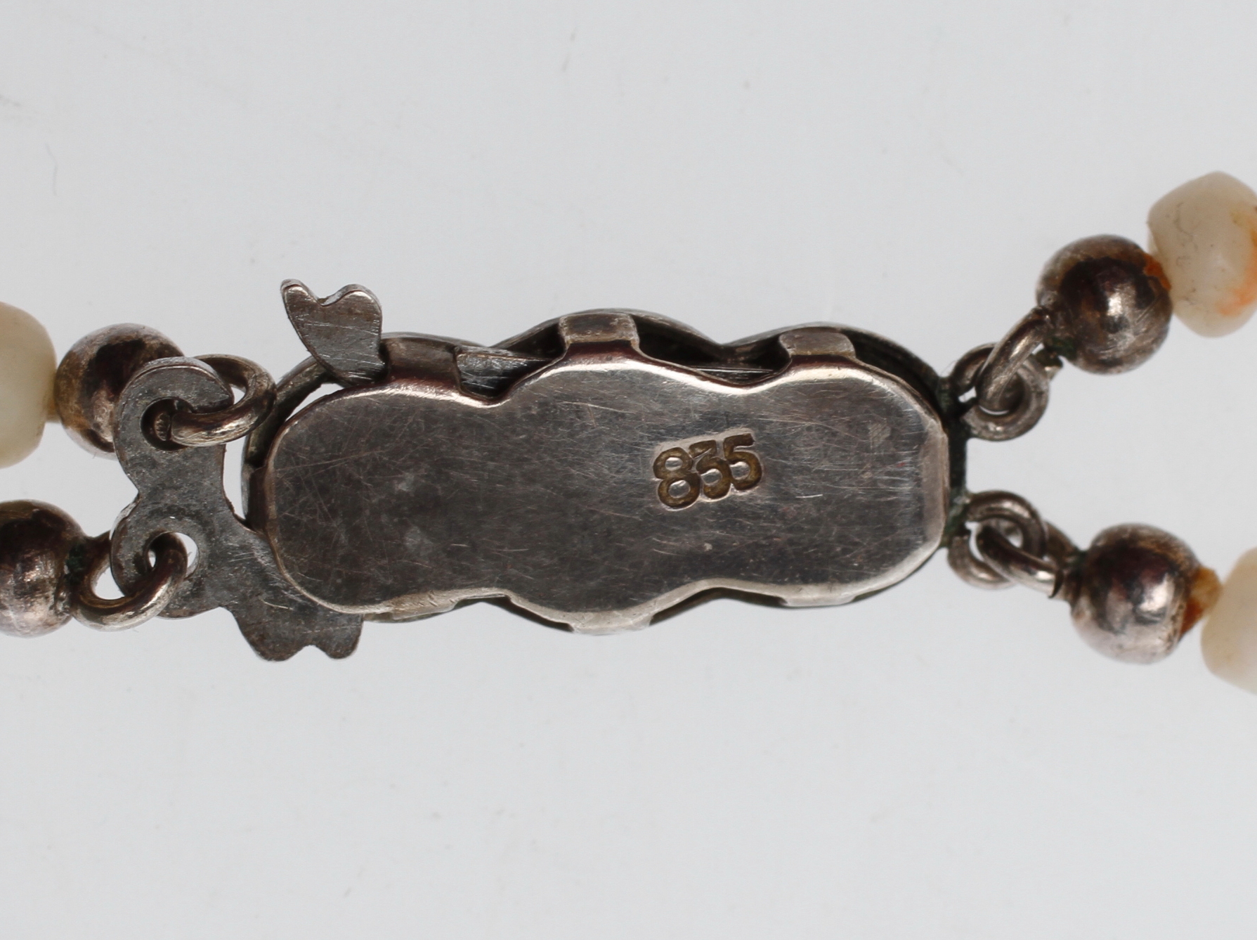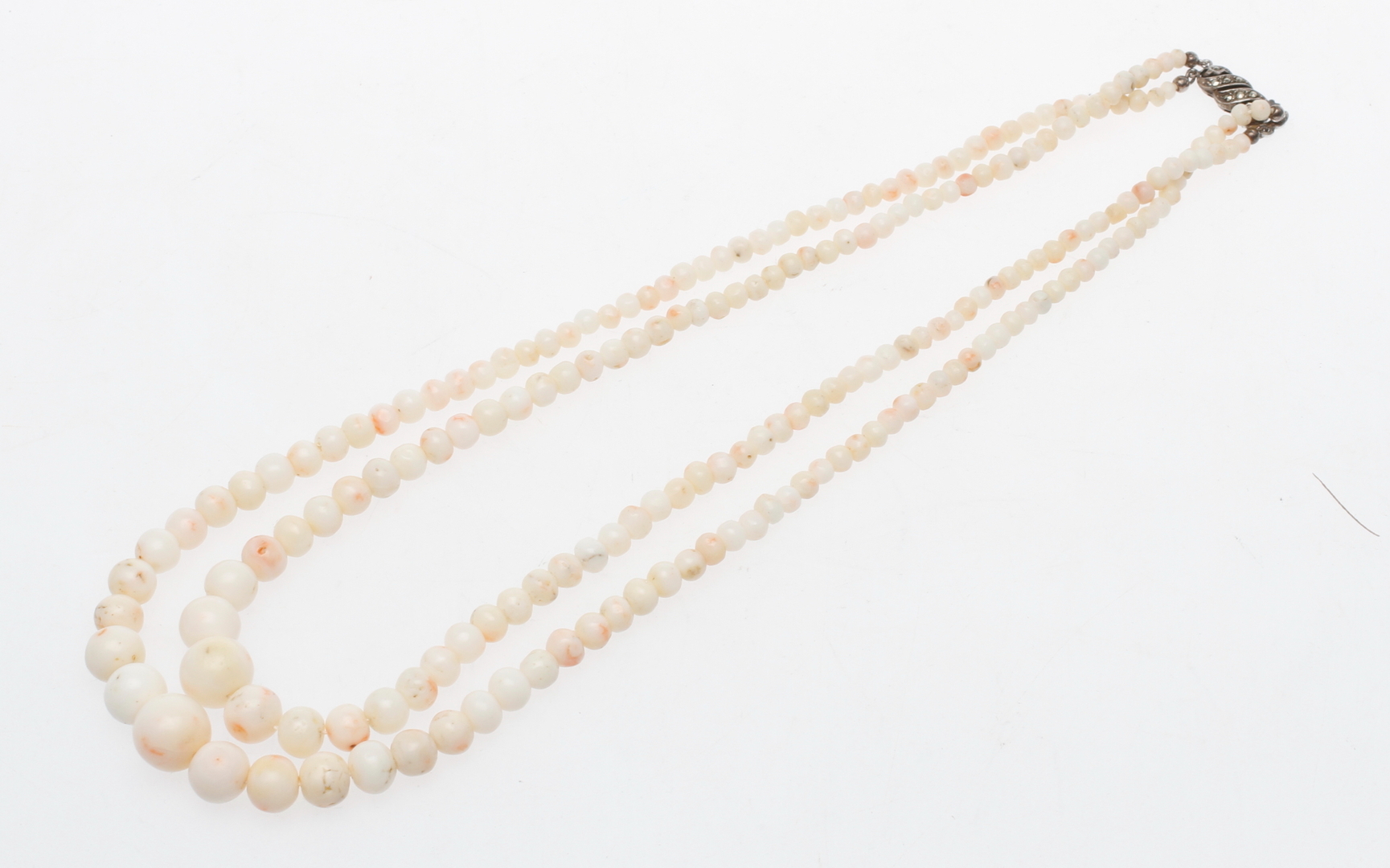 57427. NECKLACE, 2 rows, coral, silver clasp with markers.