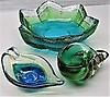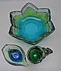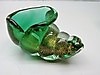 Shell green and with gold inlay Label Made in Italy Flower-shaped bowl in shades of blue and green Remains of label Färe-Marcolin art glass in Ronneby Bowl/oil lamp clear glass, turquoise and multicolored Bowl FM H: 7cm – Ø17.5cm – Weight: 155g Shell H:6cm – L:9cm – W5.5cm – Weight: 242g Oil lamp H:6.5cm – L:10.5cm – W7cm – Weight: 122g.