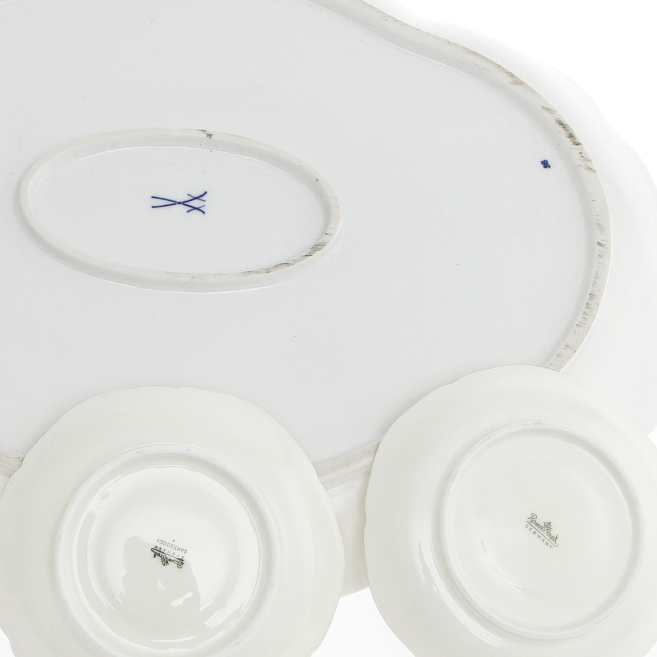 saucers Meissen 3rd assortment, 6 coffee cups with saucers, 5 mocha cups with saucers, 1 coffee pot, 1 sugar bowl "Sanssouci", Rosenthal.