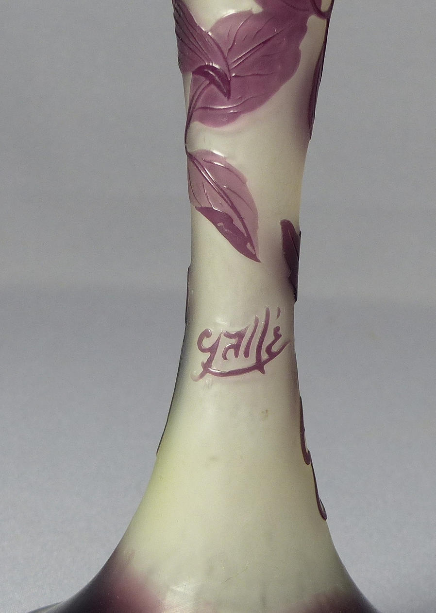 High, curved round foot, tapered hollow shaft, with socket at the top and three-sided holder for the umbrella, flowering branches all around. Colorless glass with a milky underlay and violet overlay, etched decoration. Inscribed ''Galle''. H. 30 cm.