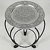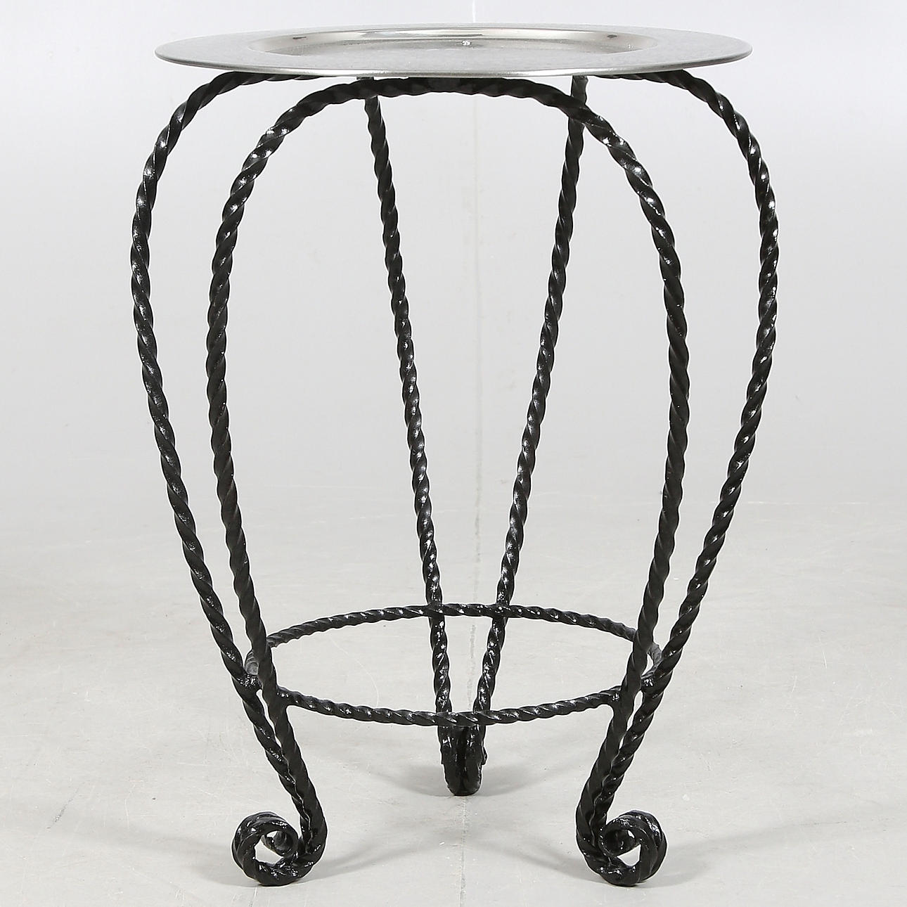 Frame of linseed oil burnt and twisted square iron. Table top with embossed decoration of flowers. Diameter 40, height 57 cm.