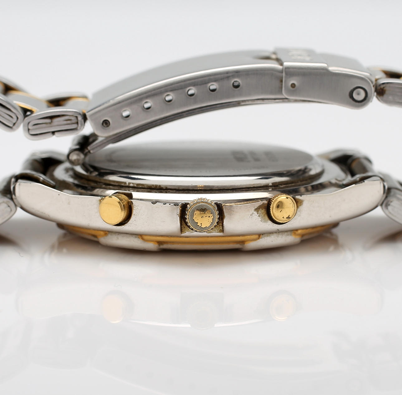 Quartz. Dark dial with date window. Bracelet with folding clasp. Diameter approx. 40 mm.
