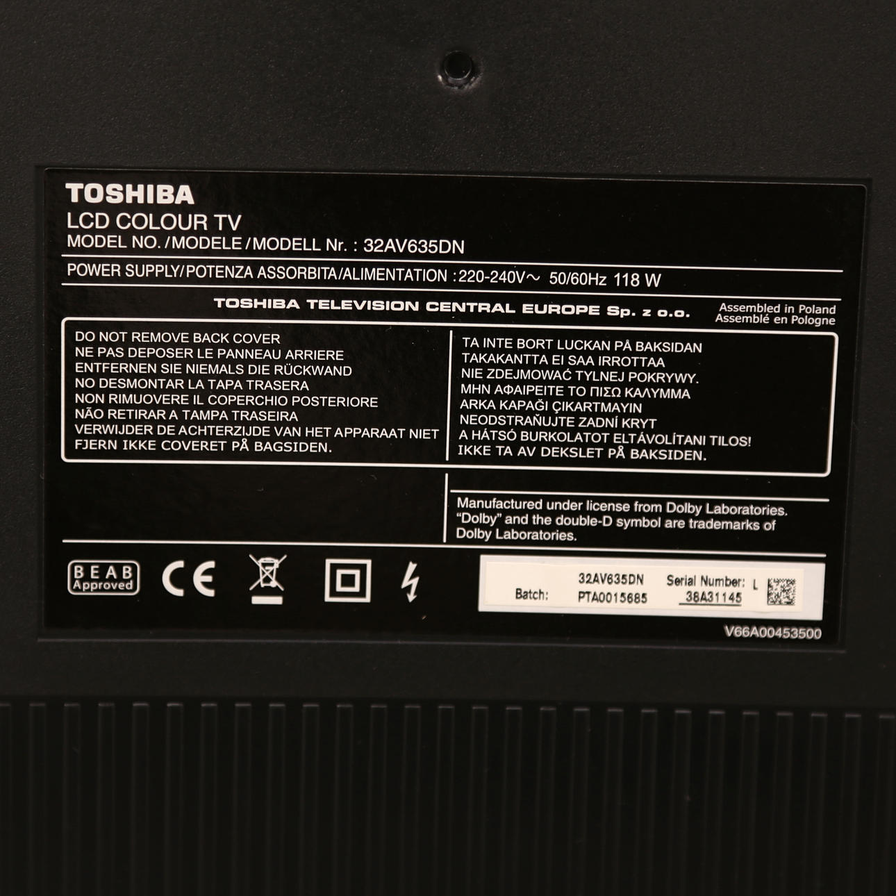 Model No. 32AV635DN. Height with foot plate 57 cm. Width 78 cm.