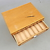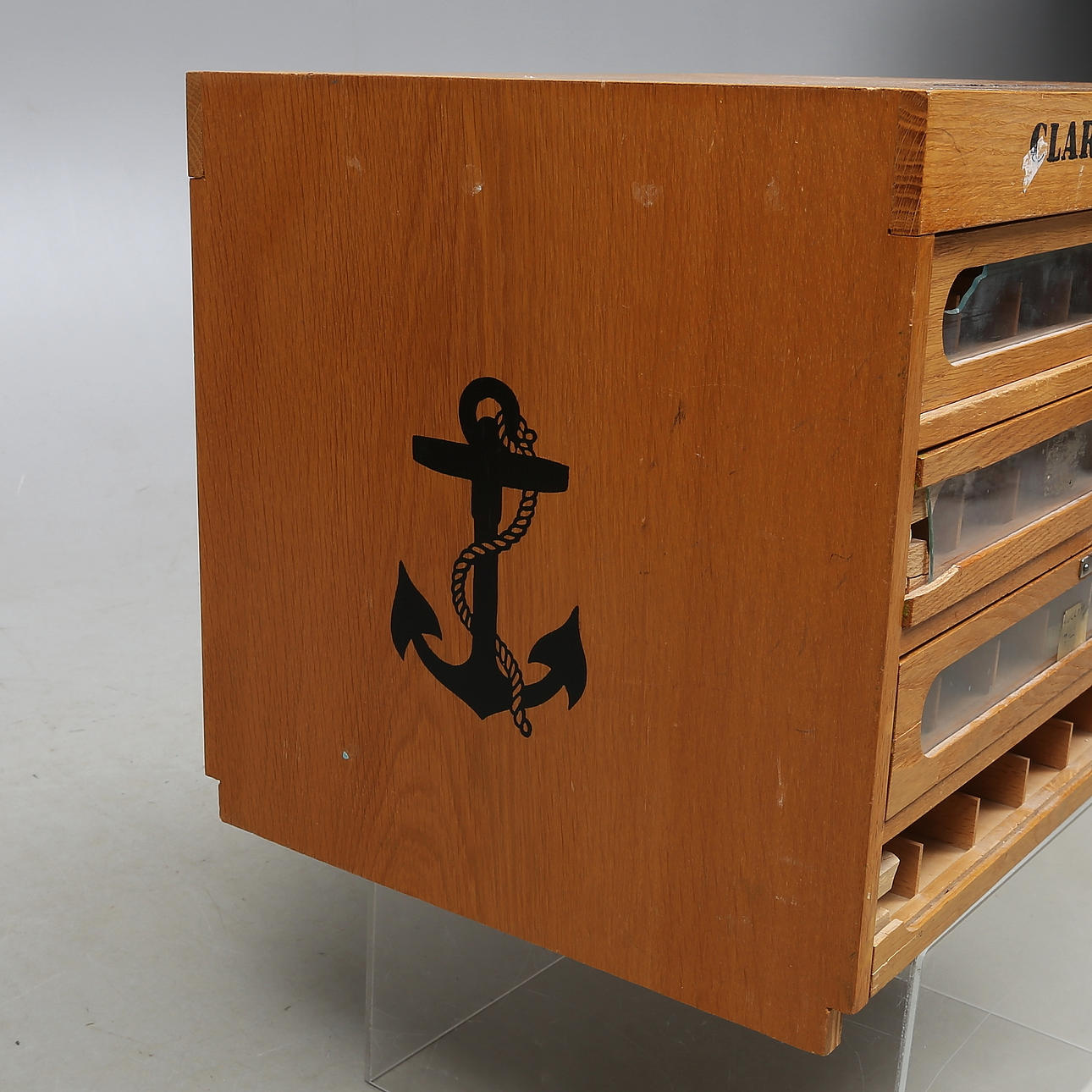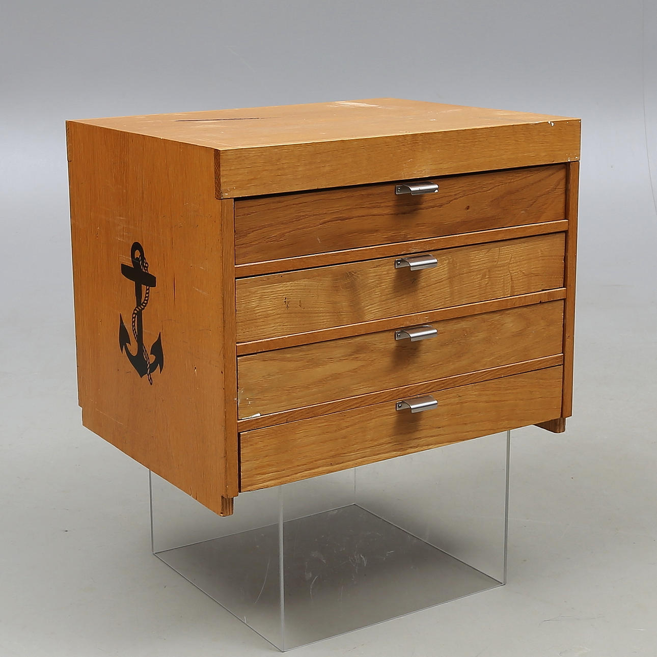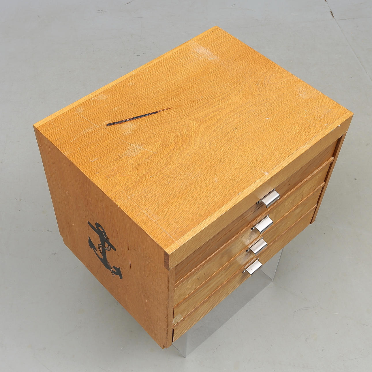 Wear, scratches, damage, top with burn, one box missing front, glass with damage. Drawers sluggish.