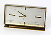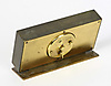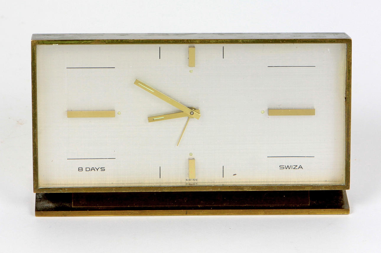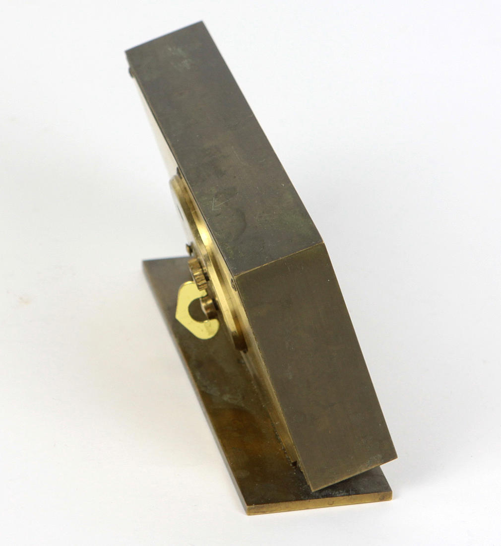 Swiss table clock, solid brass housing, mechanical 8-day movement with alarm function, working, width 15 cm, height 8.5 cm, depth approx. 4 cm.