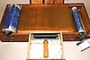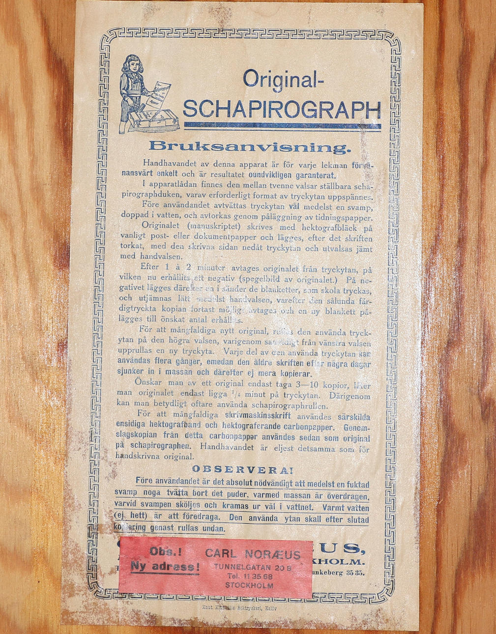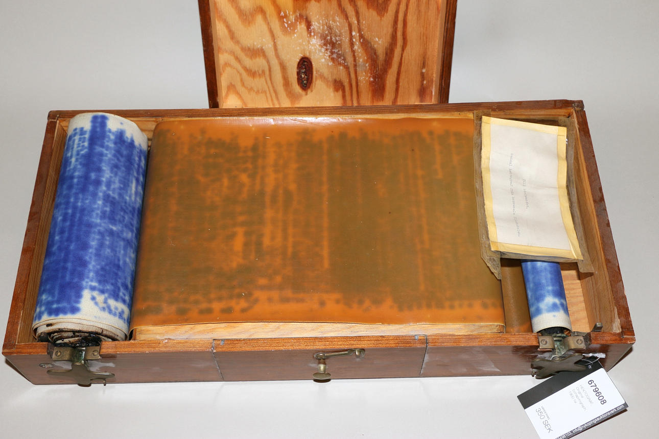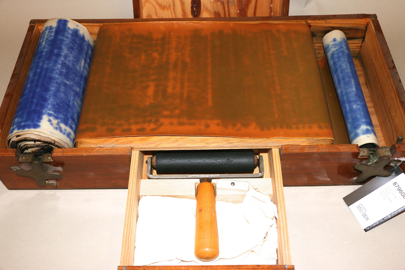 An early copying machine in a wooden box Instructions for use included Length 56, width 27, height 12.5 cm Provenance: Strängnäs museum object collection, Sundby.