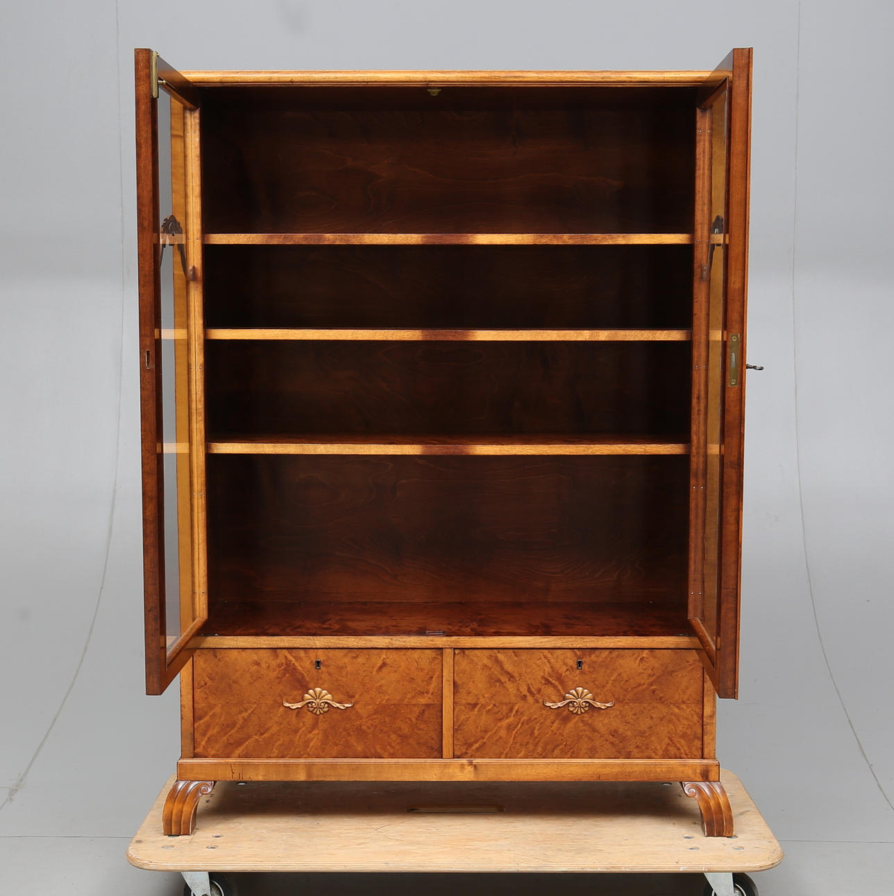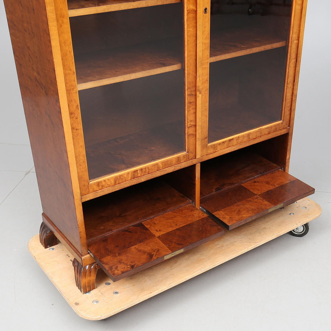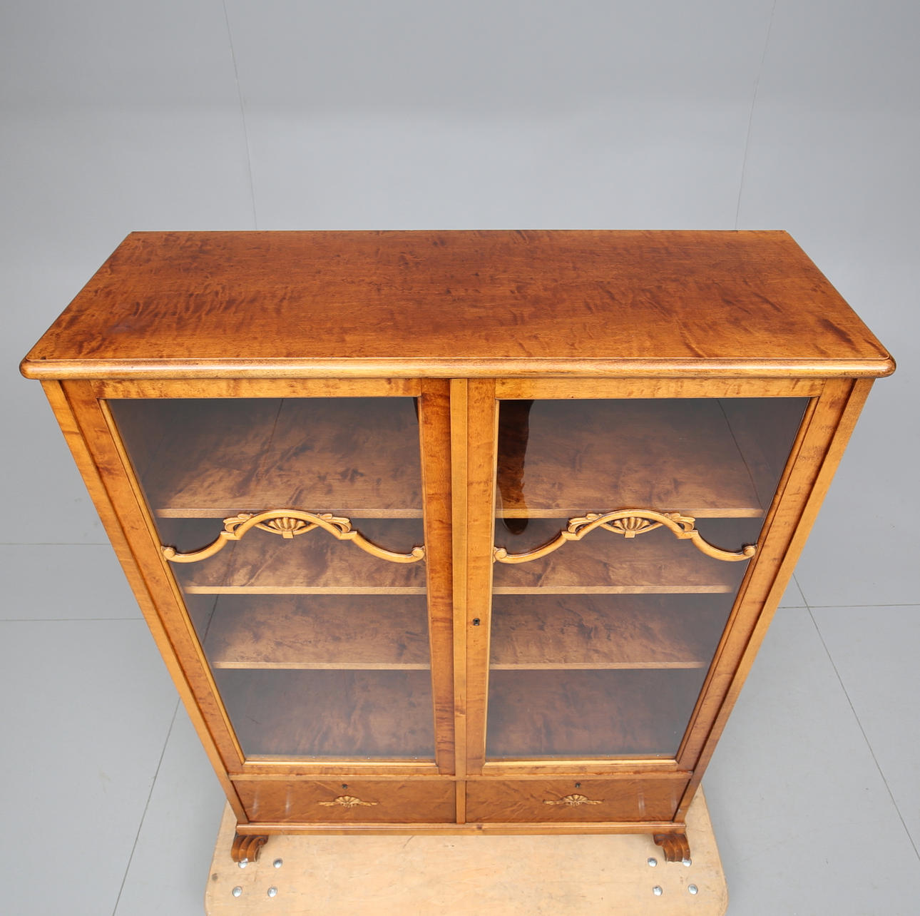 Veneered with birch. Carved decor. A glazed pair of doors with shelves behind. Two fold-down doors with storage behind. Length 107. Width 39. Height 140 cm.