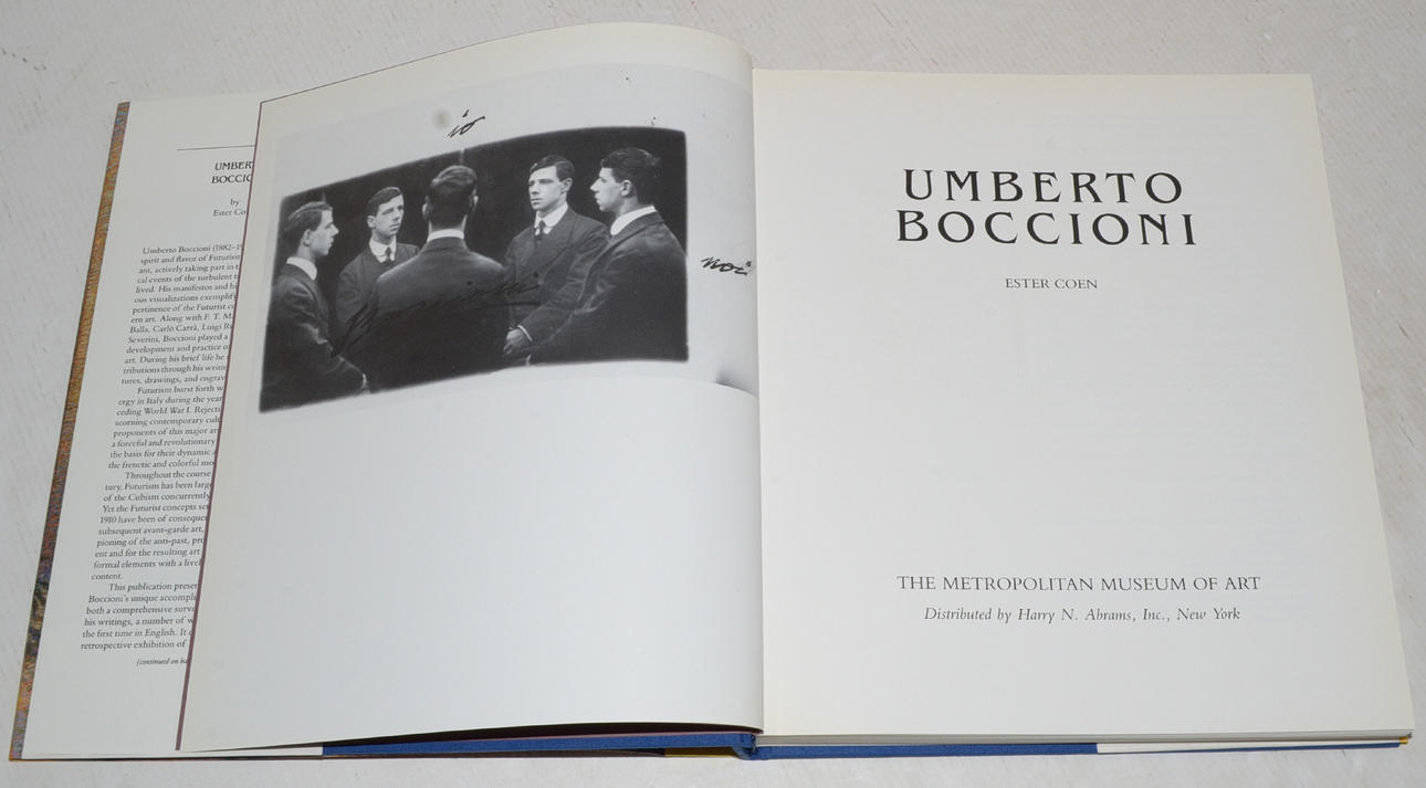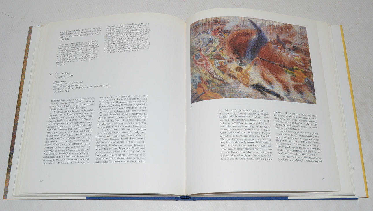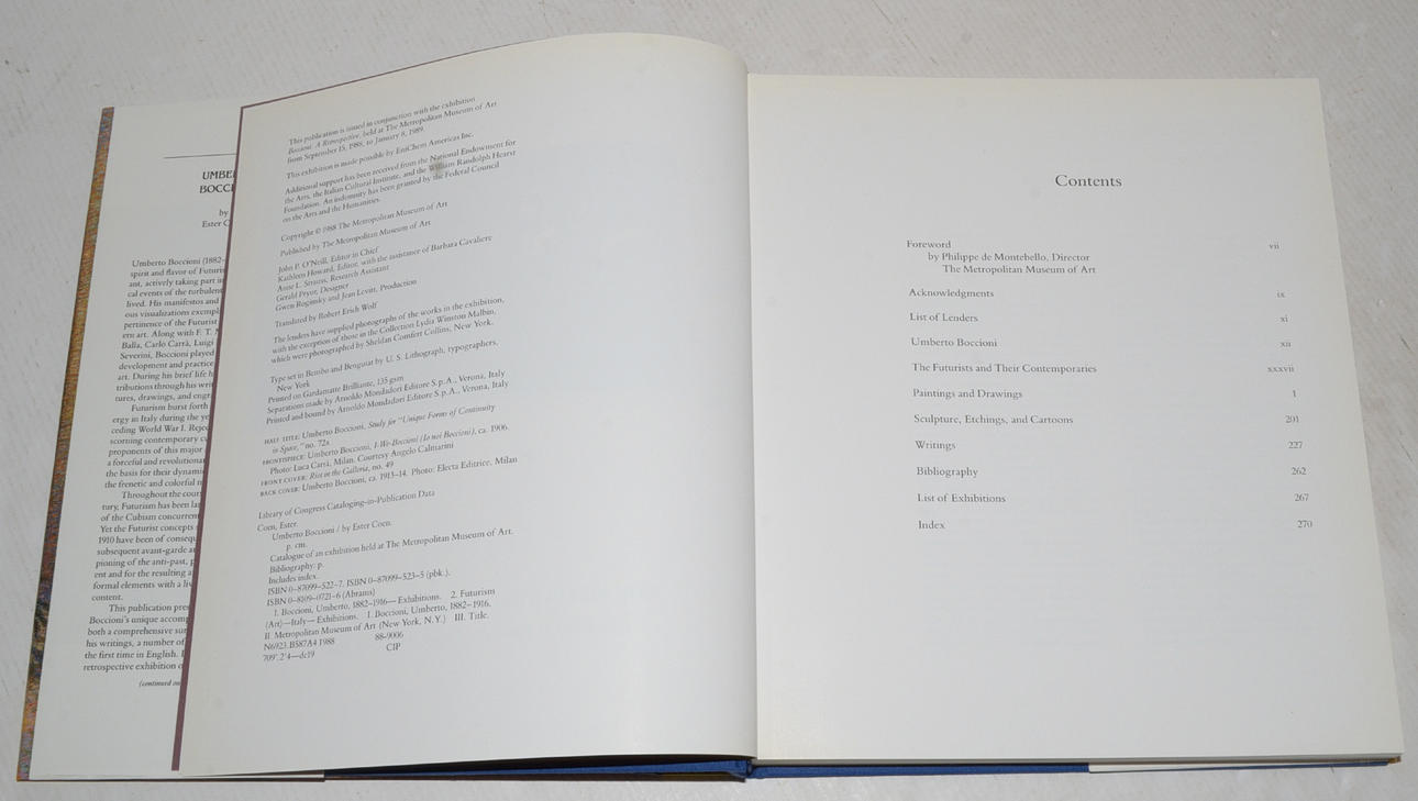 Published by the Metropolitan Museum of Art, New York (1988). Extensively illustrated, including many full page color plates. lxvi + 272 p. 191 ill. (73 colors). Published in conjunction with comprehensive exhibition of paintings, drawings, sculpture, etchings and cartoons. Foreword by Philippe de Montebello; biographical essay on the artist, with essay on "The Futurists and Their Contemporaries"; extensive notes and comments on works exhibited; selection of the artist's writings by an about the artist and on Futurism; chronological list of exhibitions, 1905-1987; bibliography.