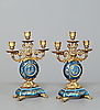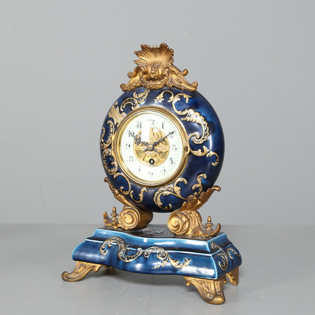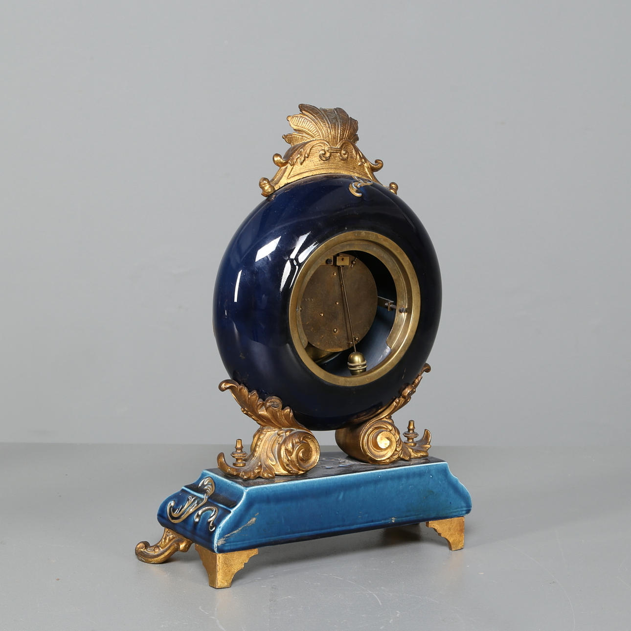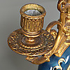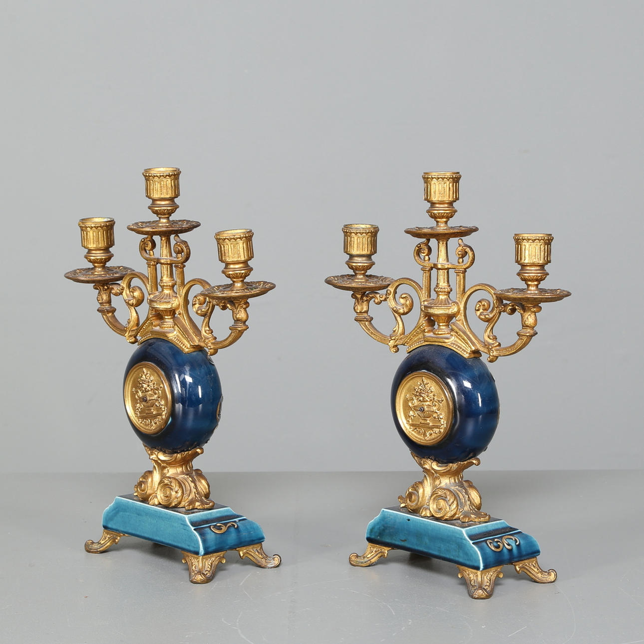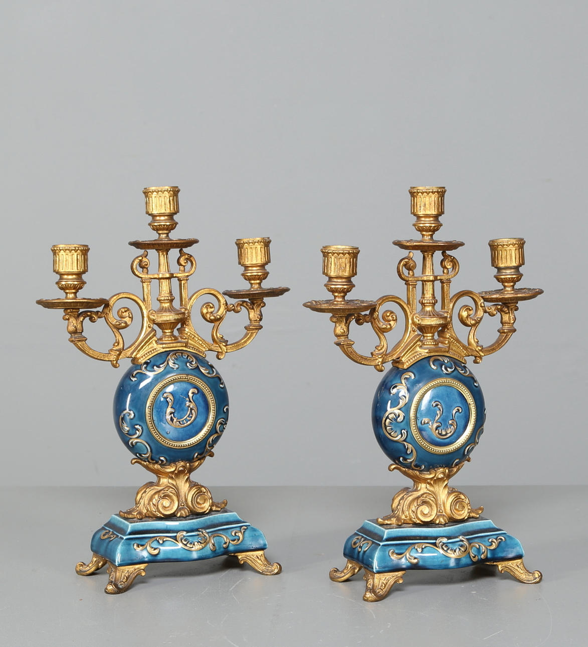 Sea blue glaze with gold decoration, gold patinated metal fittings. Table pendulum with round clockwork, candelabra with three candle arms.